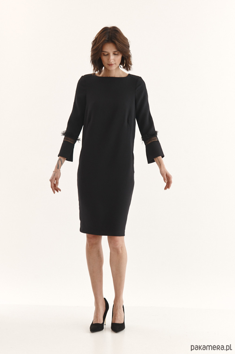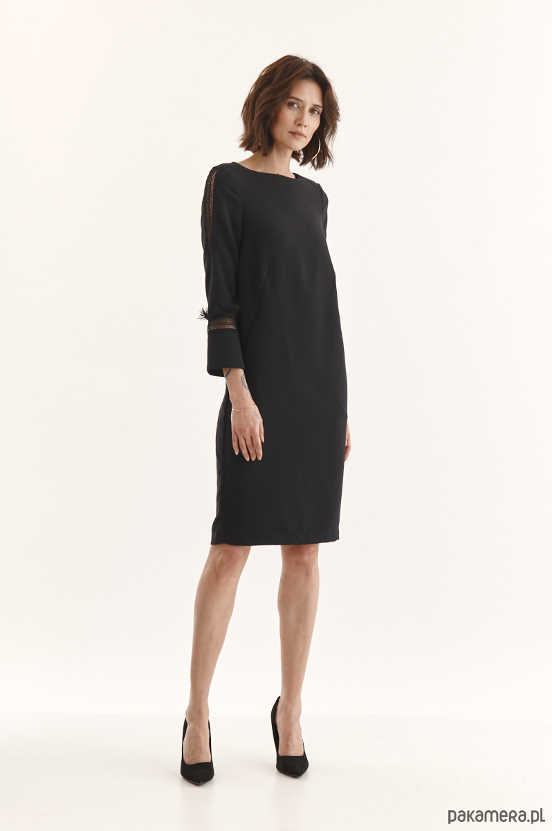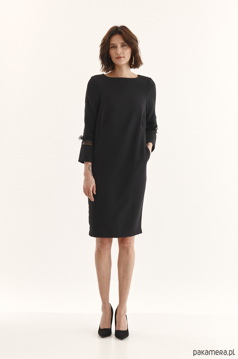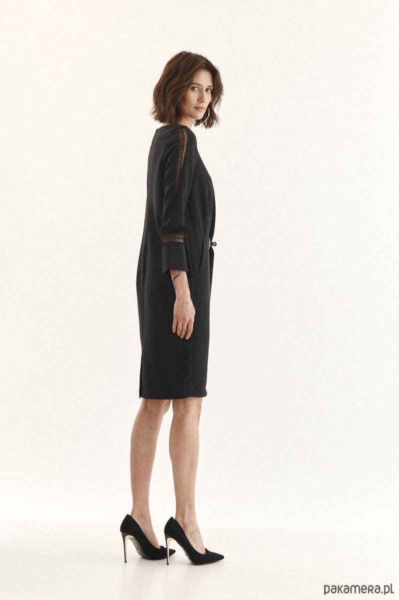 Sukienka Berenika w kształcie lekkiego oversize, lekkiego kokonu. Na przodzie kieszenie. Dekolt w kształcie łódki. Zamek na tyle. Rozporek na tyle. Rękaw z pęknięciem, ozdobiony gipiurą, długość 3/4.