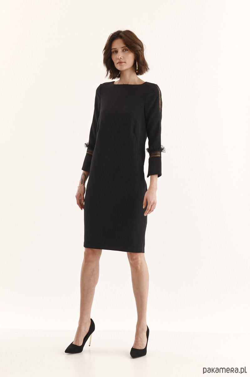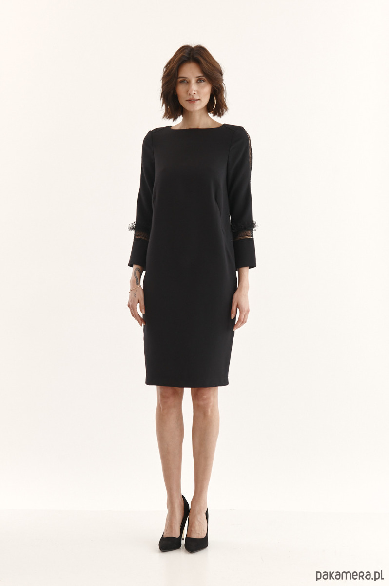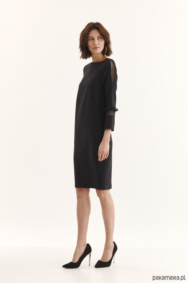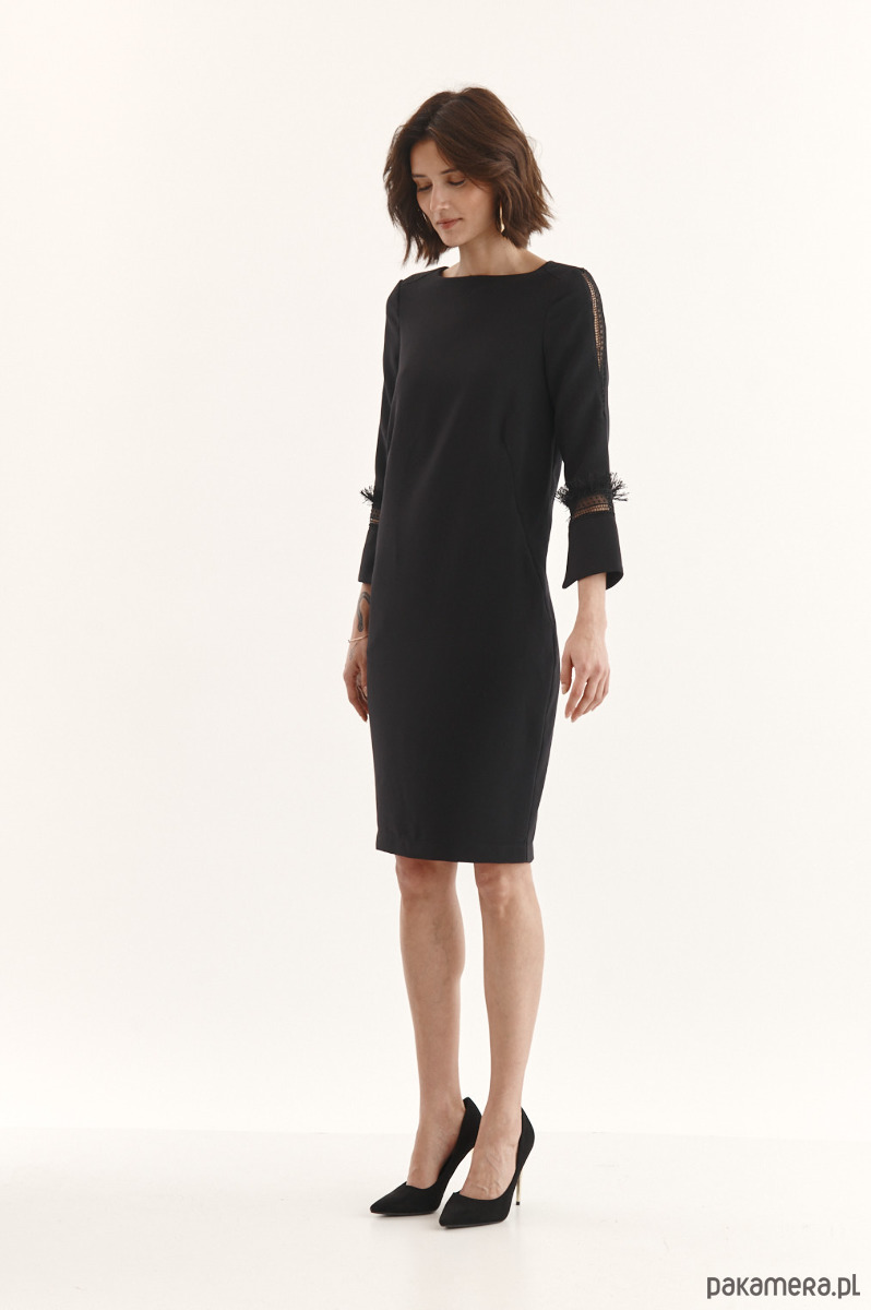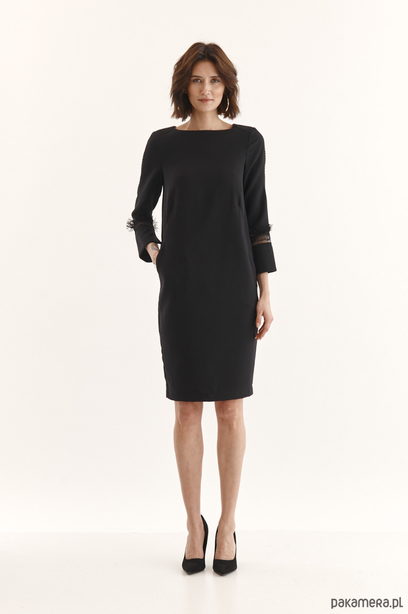 Sukienka Berenika w kształcie lekkiego oversize, lekkiego kokonu. Na przodzie kieszenie. Dekolt w kształcie łódki. Zamek na tyle. Rozporek na tyle. Rękaw z pęknięciem, ozdobiony gipiurą, długość 3/4.