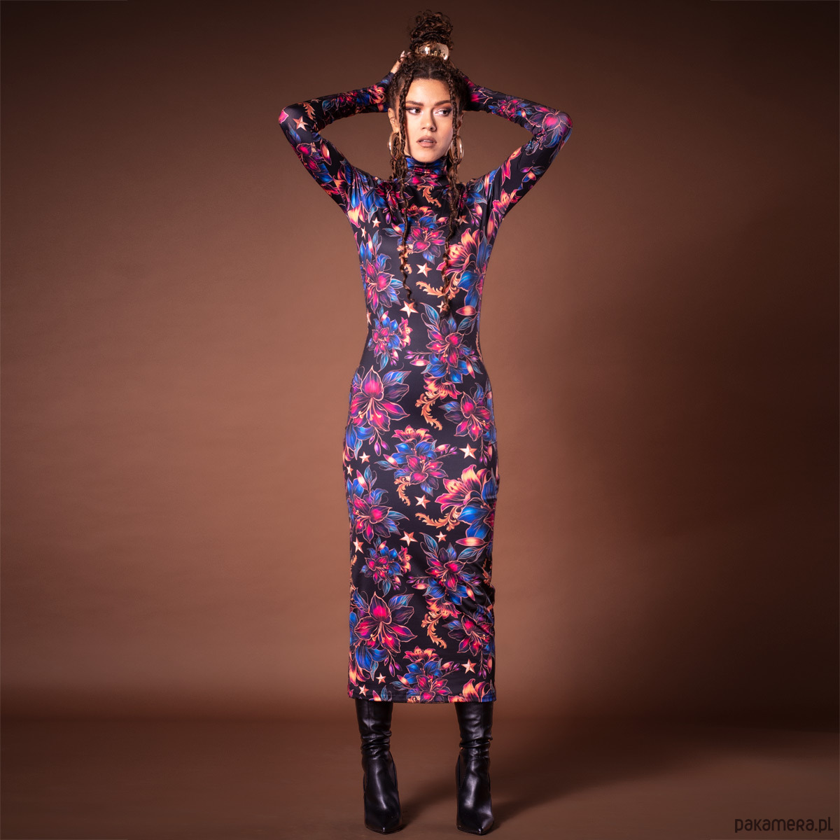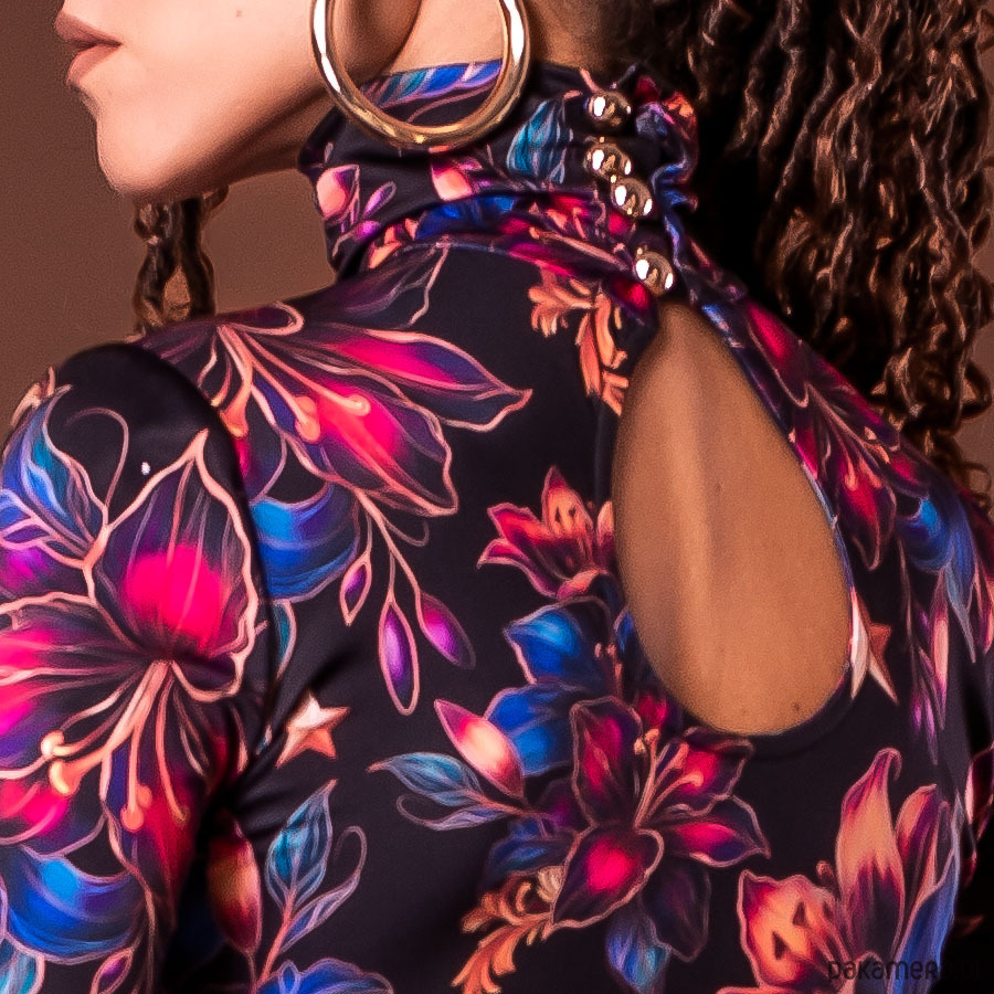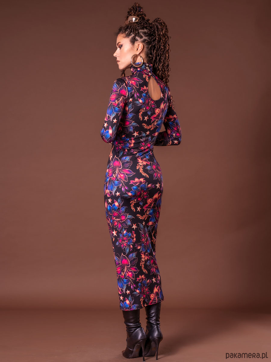 Ta sukienka to kwintesencja elegancji i nowoczesności. Wykonana z jerseyu z autorskim printem, łączy styl z funkcjonalnością. Góra sukienki została zaprojektowana w stylu naszego bestsellerowego golfu – zapięcie na złote guziki z tyłu pozwala na idealne dopasowanie do szyi, bez obaw o rozciąganie czy zniszczenie fryzury i makijażu.