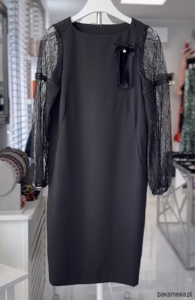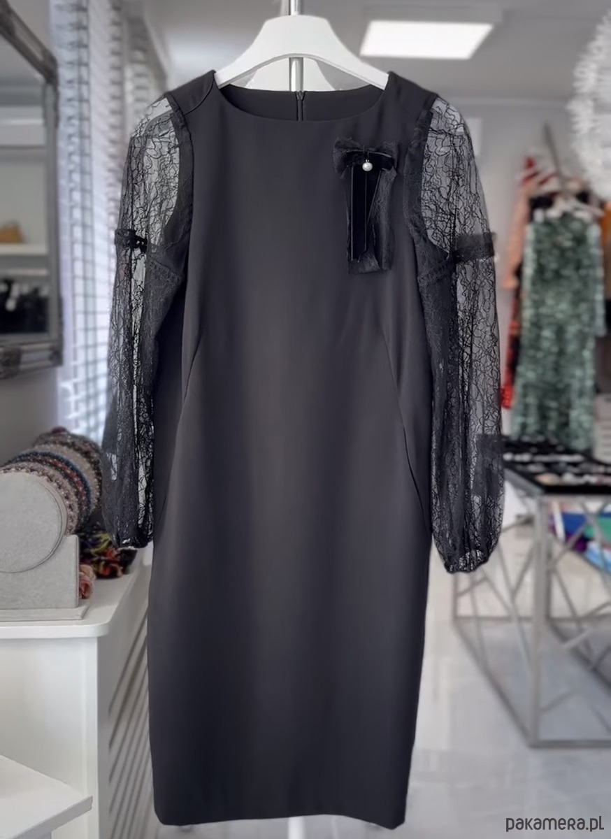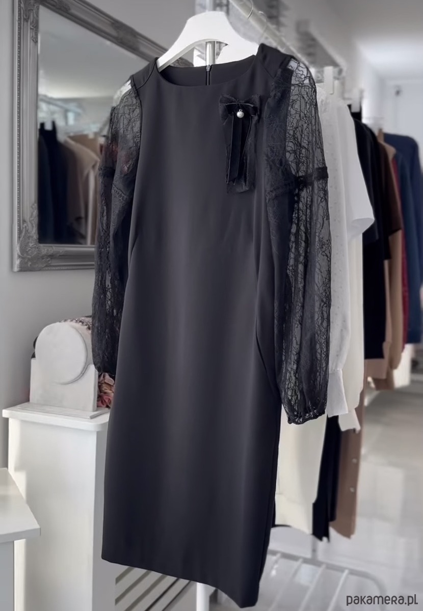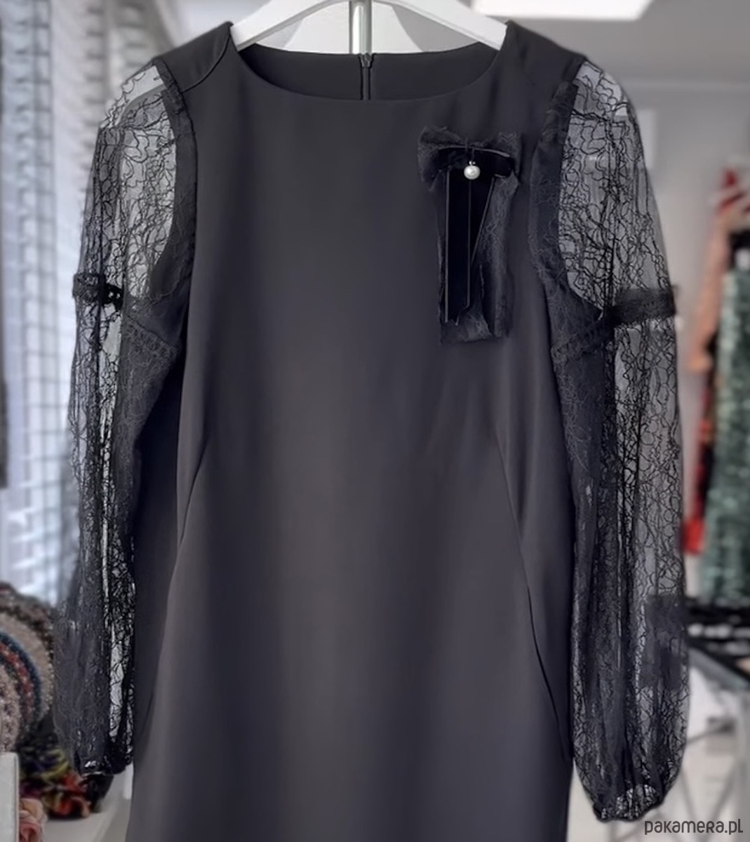 Sukienka Galla w kształcie lekkiego oversize, lekkiego kokonu. Na przodzie kieszenie ukryte w cięciu. Dekolt w kształcie łódki. Zamek na tyle. Rozporek na tyle. Rękaw z haftowanej koronki, ozdobiony gipiurą, na dole bufa z gumką. Ozdobna przypinka z koronki i aksamitu.