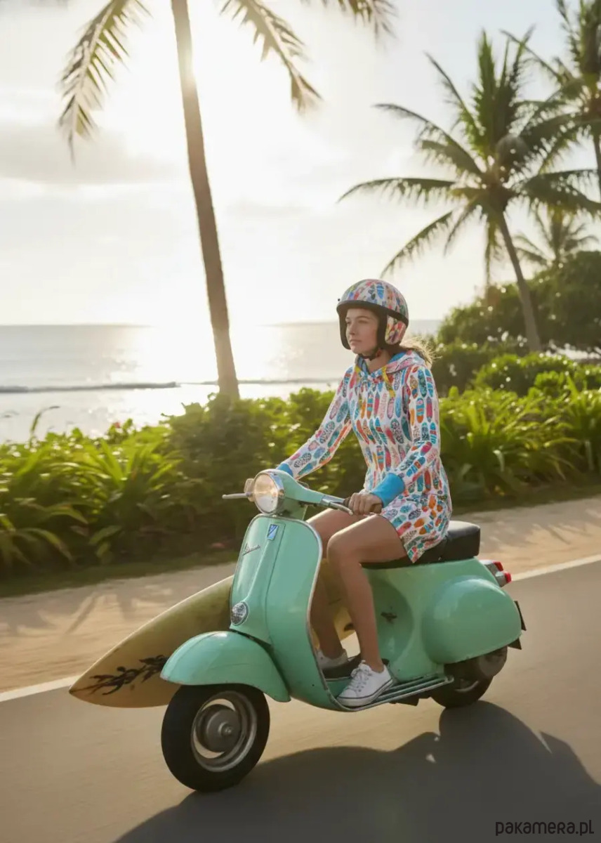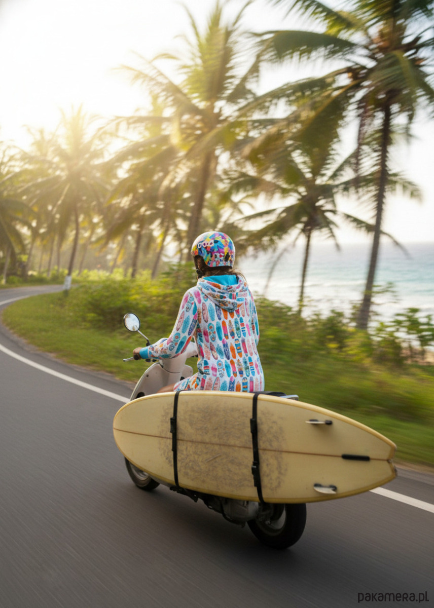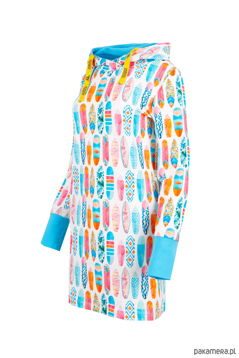 Poczuj letni luz i wygodę w wyjątkowej sukience-tunice z kapturem uszytej w małej krakowskiej manufakturze! Pastelowy wzór w deski surfingowe przywołuje klimat nadmorskich wakacji, a miękka bawełniana dzianina z 5% elastanu gwarantuje komfort noszenia i trwałość nadruku.