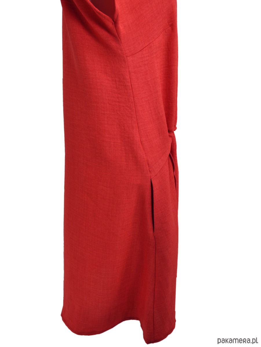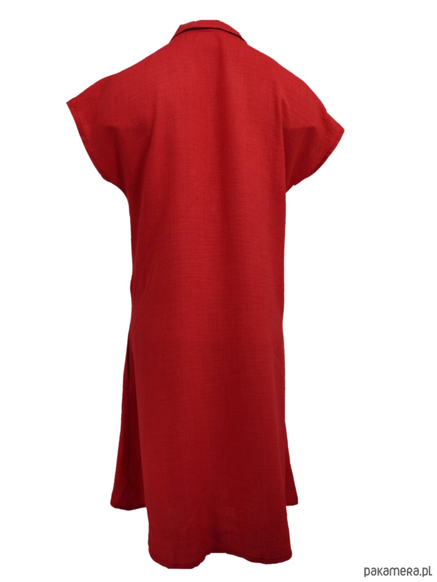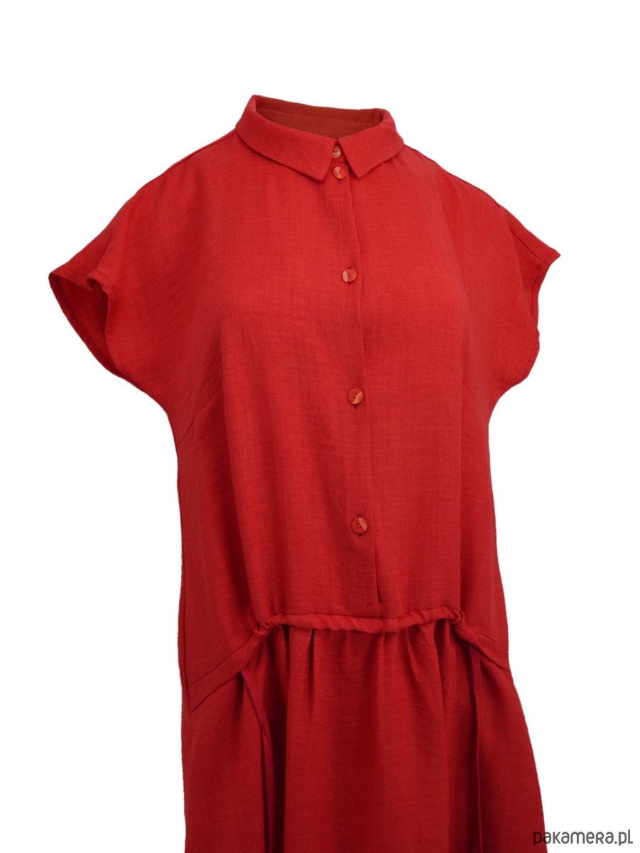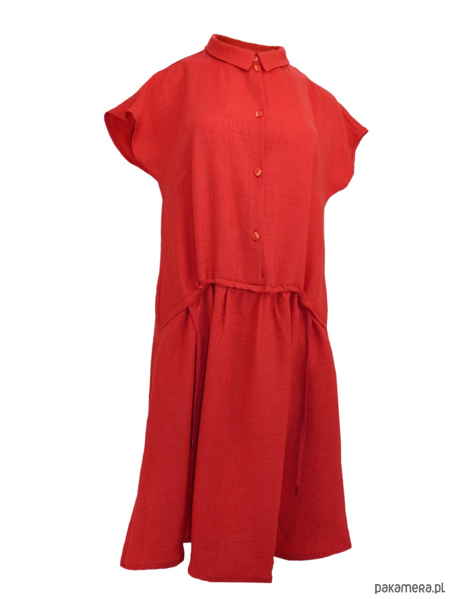 Sukienka z przewiewnej, tkaniny z delikatnym melanżem. Sukienka doskonała na wakacyjne wyjazdy oraz na upalne lato w mieście. Sukienka luźna, do kolan, rozkoszowana w kształcie litery A . Na przodzie ma zapinanie na guziki oraz tunel ze sznurkiem, można go fantazyjnie zmarszczyć. Szyja wykończona kołnierzykiem. Kieszenie na bokach, w szwach. Rękawek kimonowy.