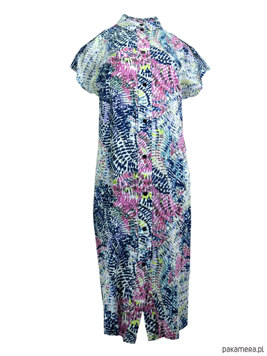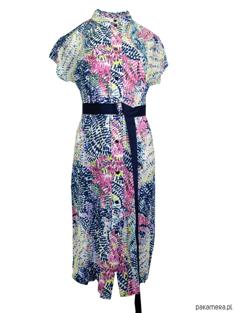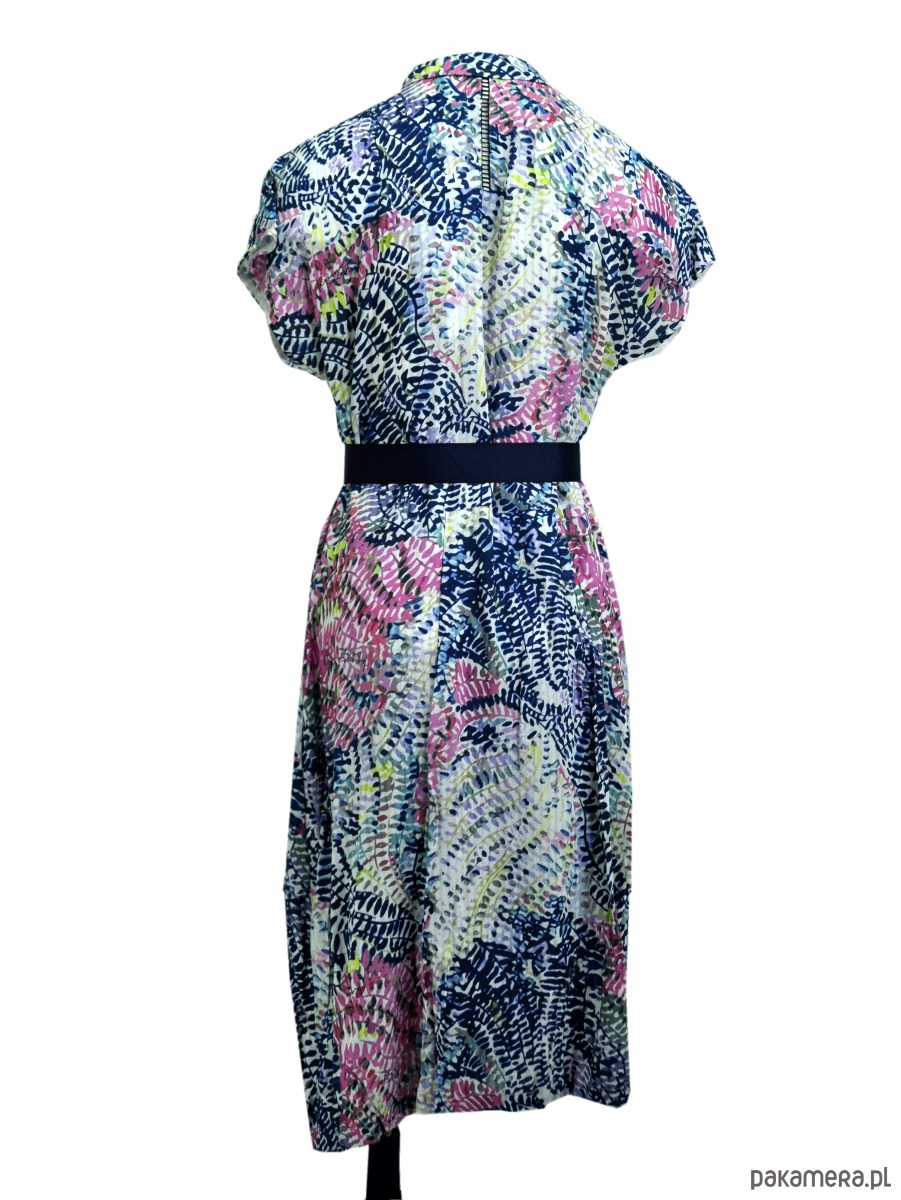 Sukienka typu szmizjerka. Tkanina wiskozową z roślinnym nadrukiem. Druk oczywiście autorski. Zapinana na kontrastowe, granatowe guziki na przodzie. Lekko rozszerzony krój, z możliwością przewiązania paskiem . Kołnierz przy szyi. Kieszenie w szwach bocznych. Krótki rękawek. Granatowe wstawki z ozdobnej "drabinki" gipiury.