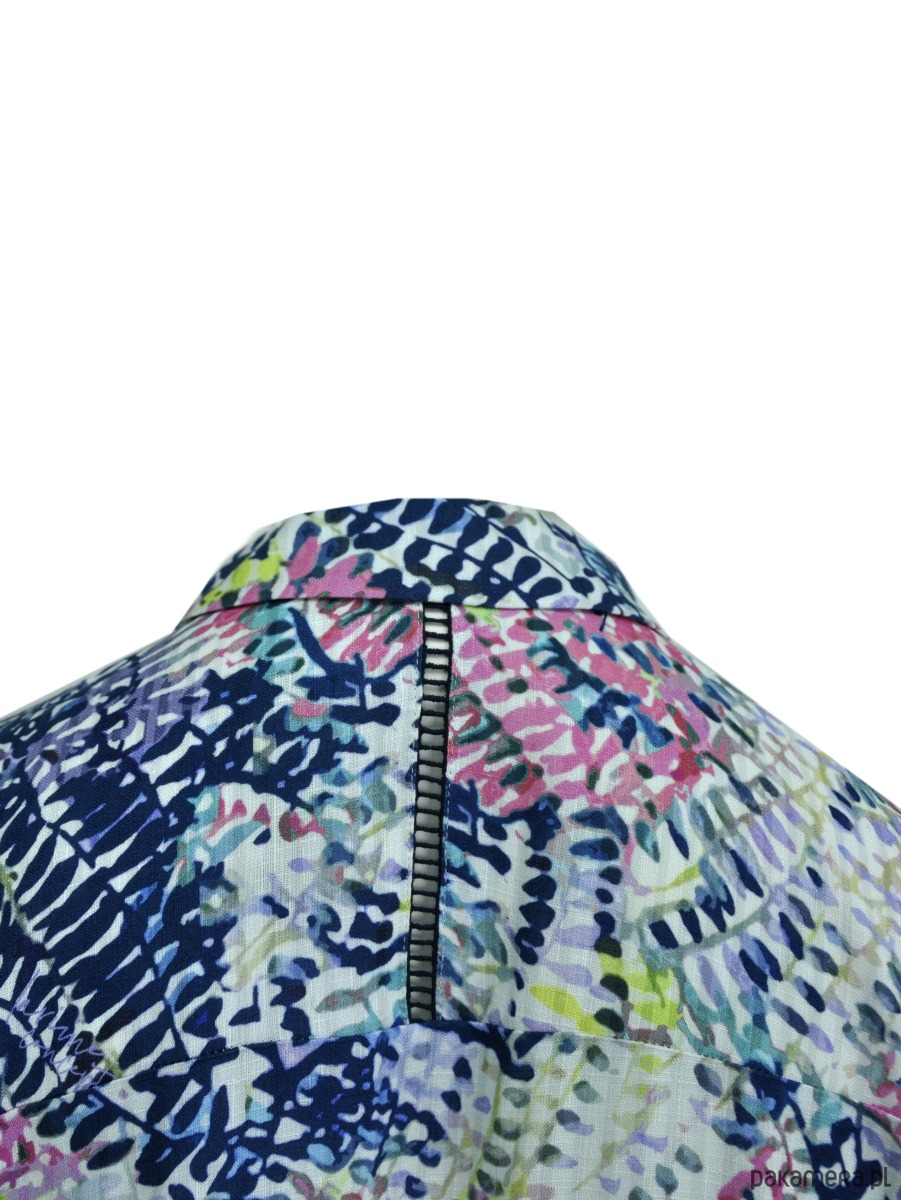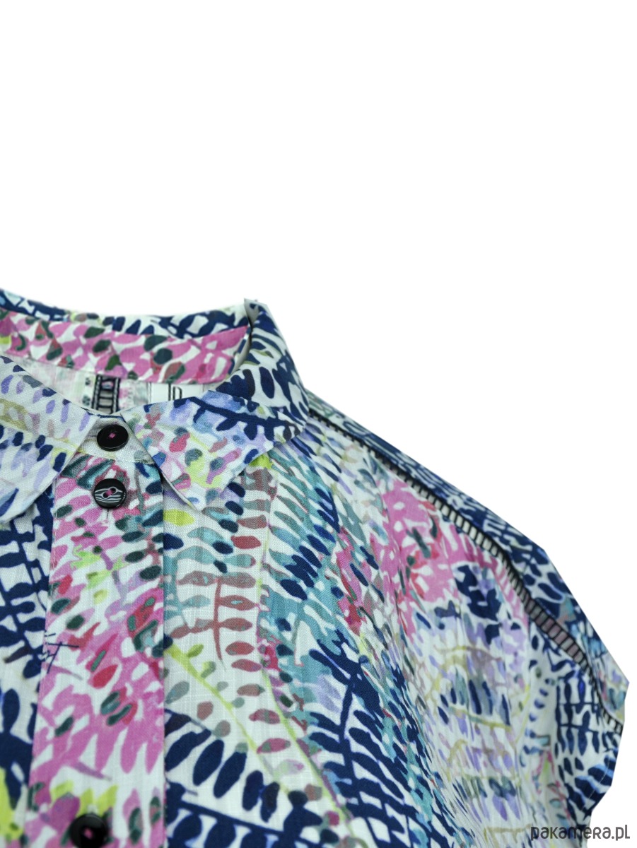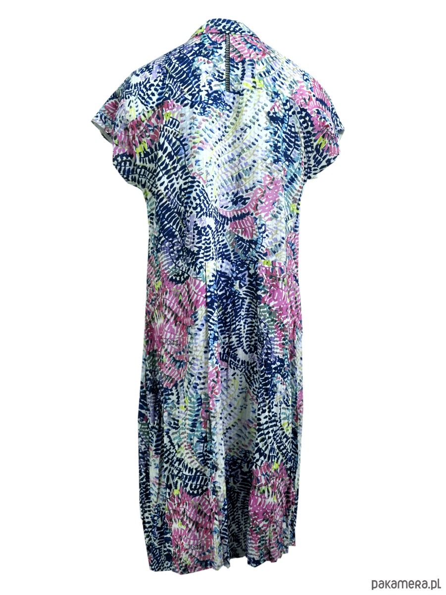 Sukienka typu szmizjerka. Tkanina wiskozową z roślinnym nadrukiem. Druk oczywiście autorski. Zapinana na kontrastowe, granatowe guziki na przodzie. Lekko rozszerzony krój, z możliwością przewiązania paskiem . Kołnierz przy szyi. Kieszenie w szwach bocznych. Krótki rękawek. Granatowe wstawki z ozdobnej "drabinki" gipiury.