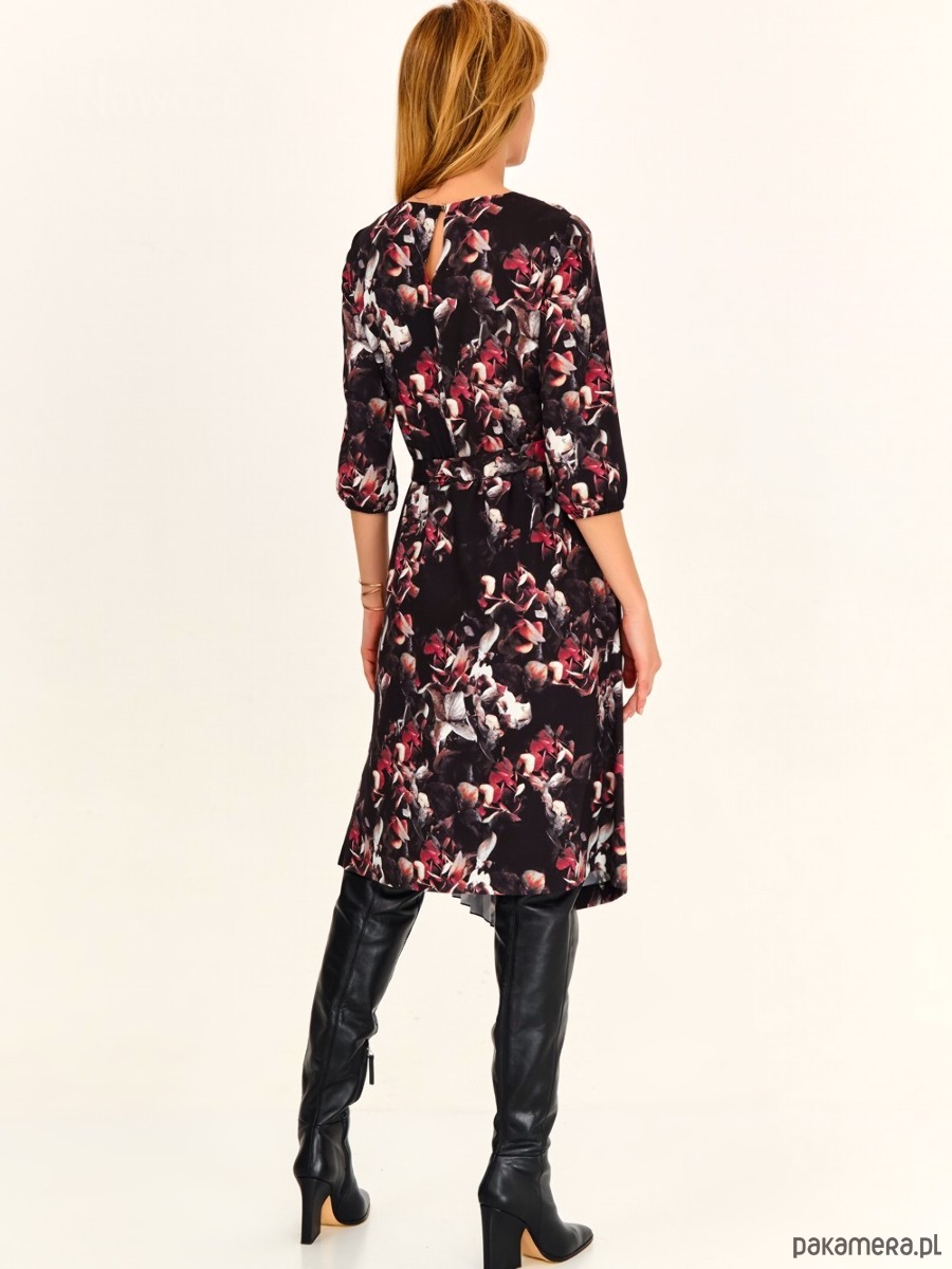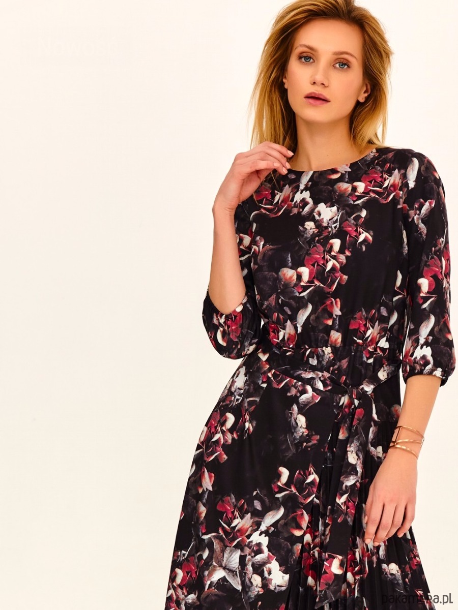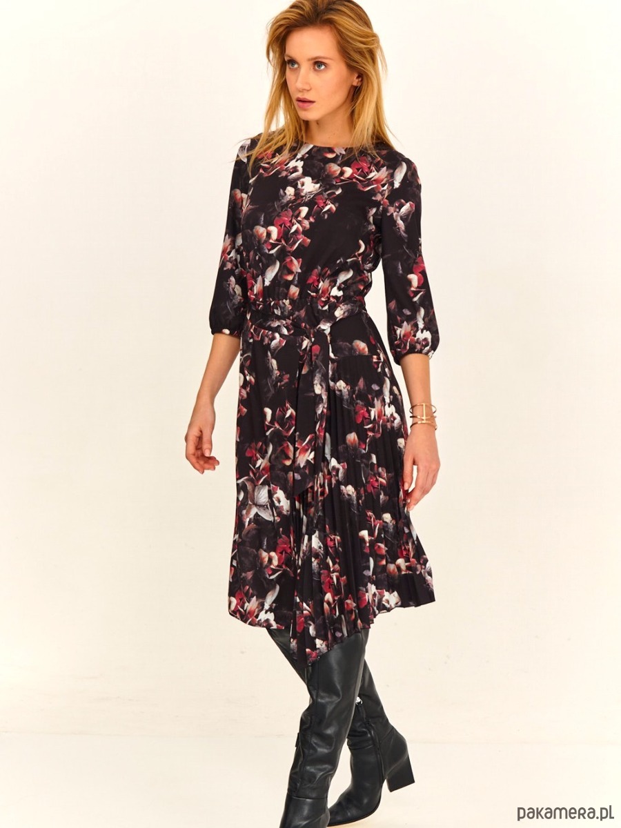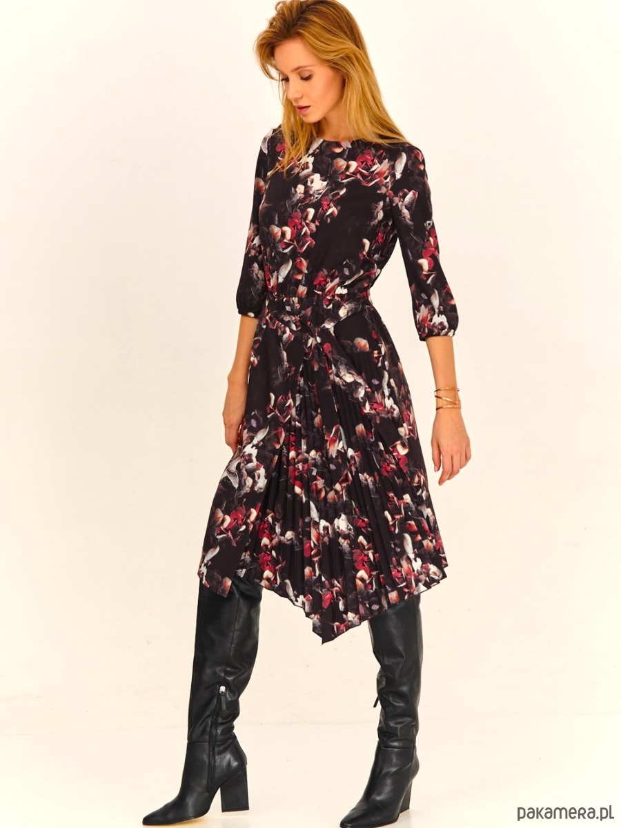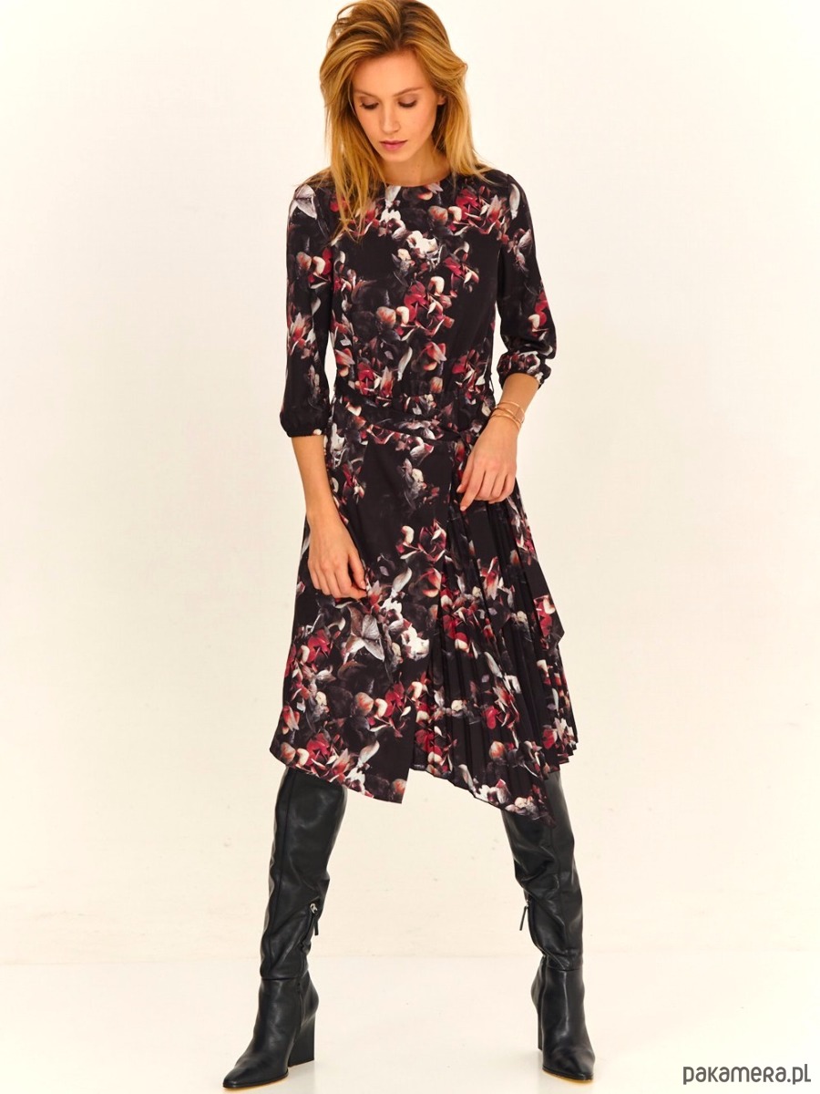 Sukienka z częściowo plisowanym podwójnym przodem. Druk autorski. Rękaw 3/4 z dołem z bufką, z gumką. Pasek w talii oraz gumka. Zapięcie przy szyi na guzik.