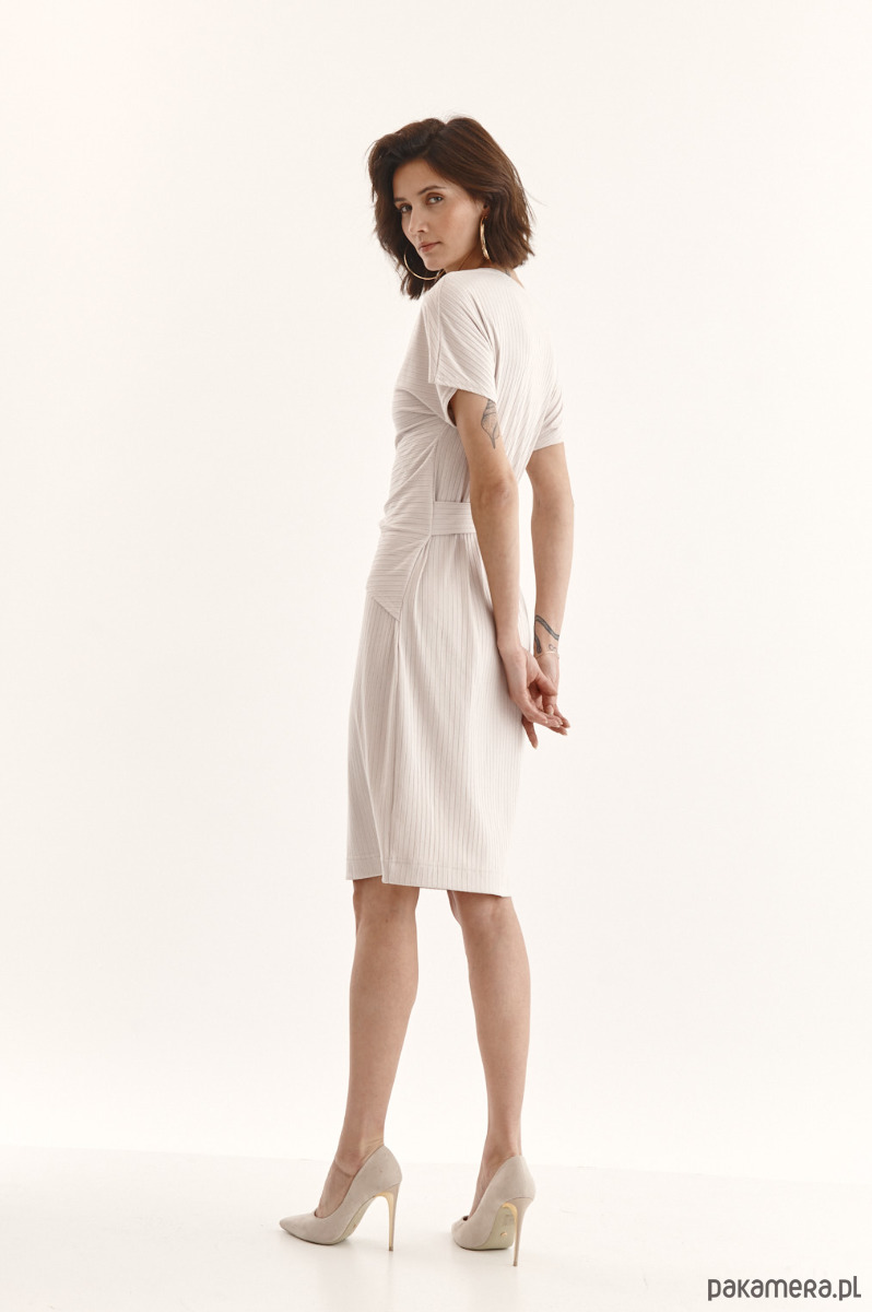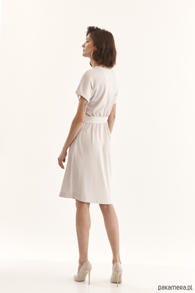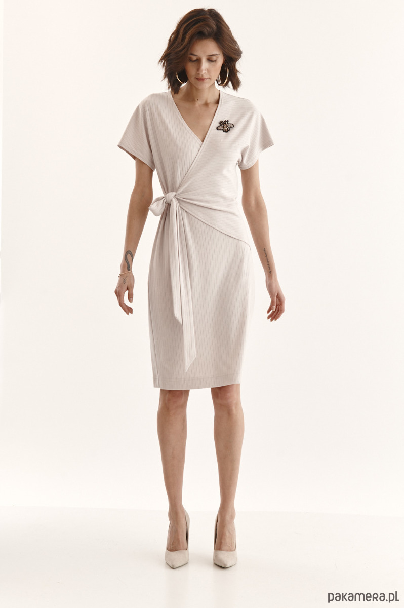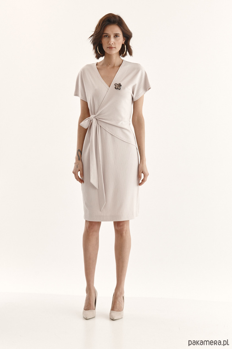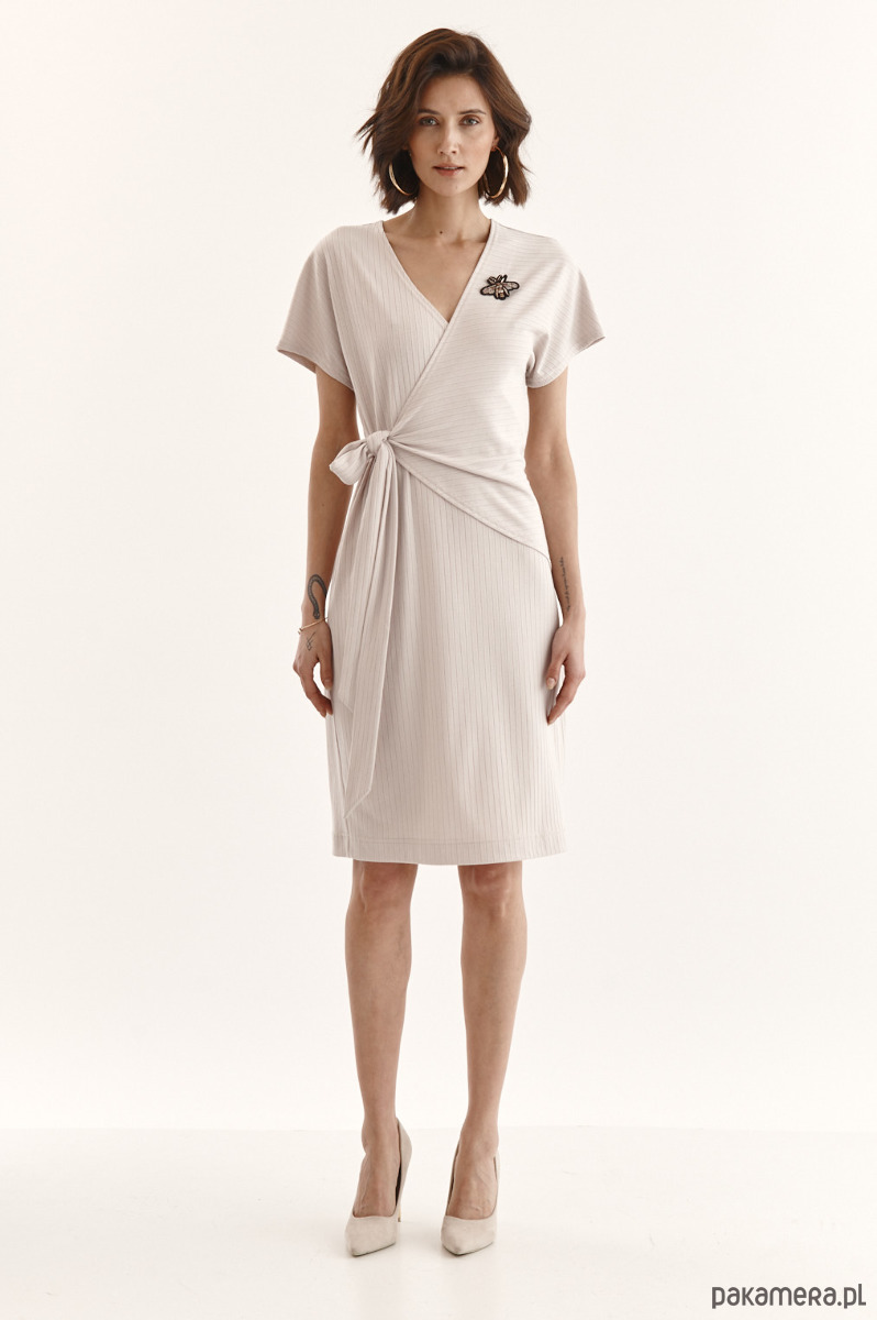Sukienka Beata ze strukturalnej, ribowej dzianiny. Struktura w tej dzianinie to płaski, delikatny ściągacz. Przód z kopertowym dekoltem, którego głębokość można regulować. Część zewnętrzna prądu lekko kamuflująca częścią brzuch . Wiązanie w talii, wokół sylwetki. Kieszeń w bocznym szwie. Ozdobna przypinka na sukience - pin.