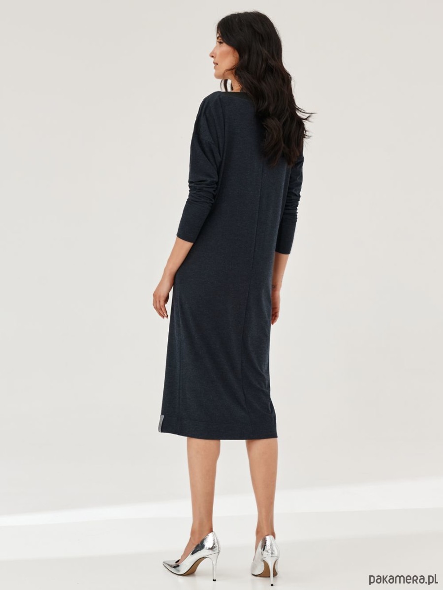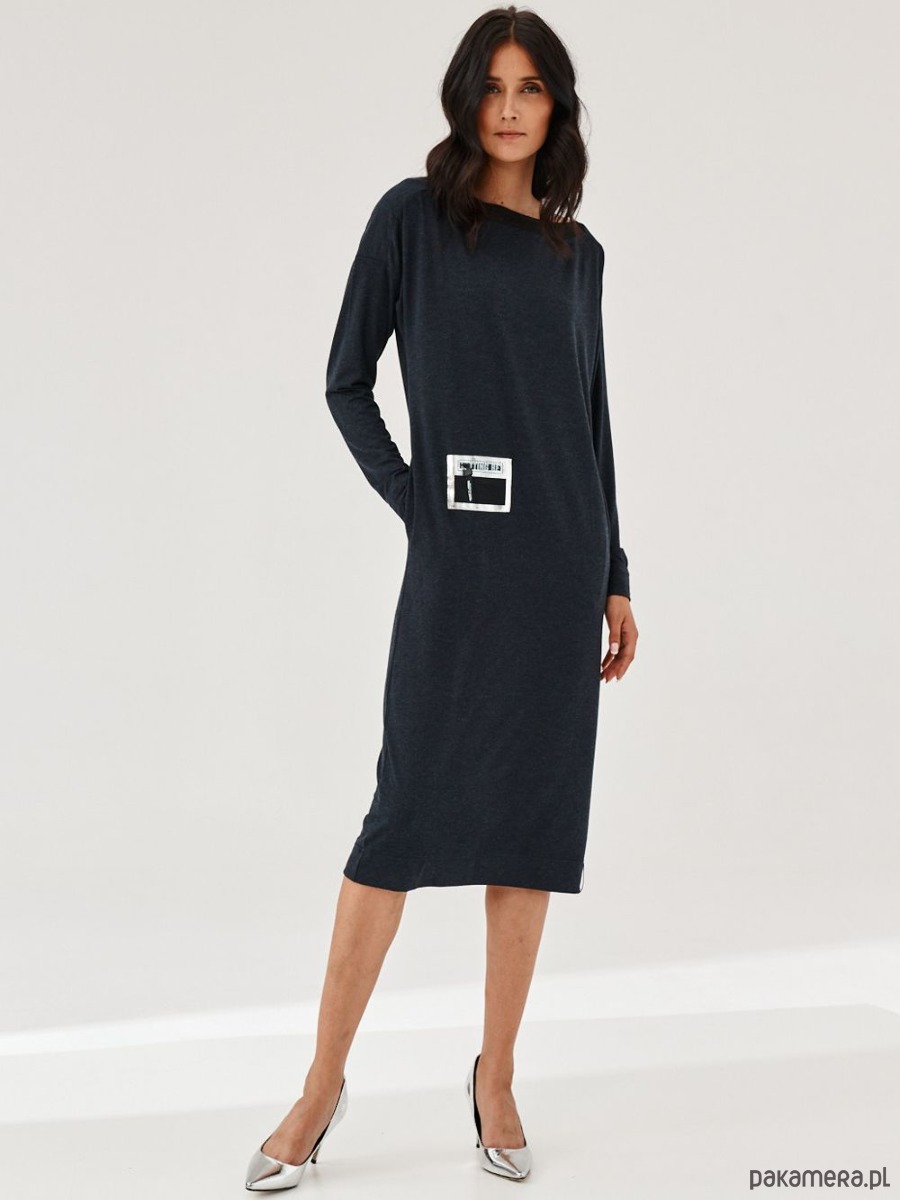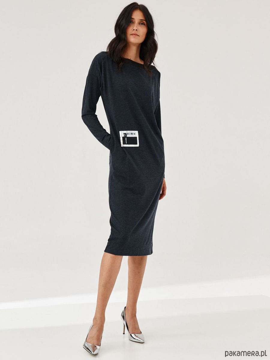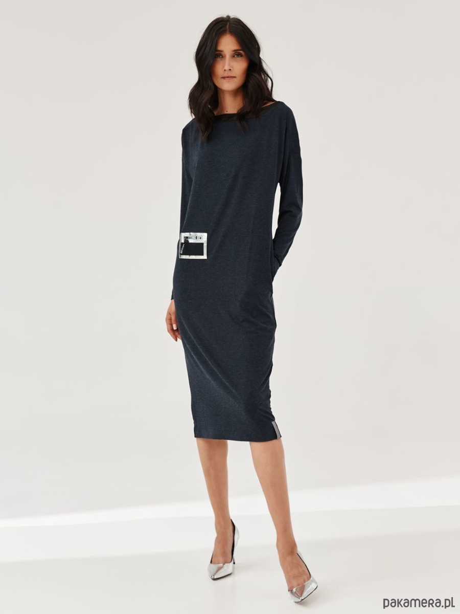 Sukienka Afi uszyta jest z elastycznej dzianiny. Dzianina jest miękka i ciepła w dotyku, w kolorze melanżowego granatu z grafitem. Forma sukienki jest lekko od ciała, co daje wiele możliwości stylizacji. Ponadto sukienka ma oczywiście kieszenie. Na przodzie efektownym akcentem jest Srebrna kieszonka z siateczką. Szyja w kształcie łódzki, wykończona czarną pliską.