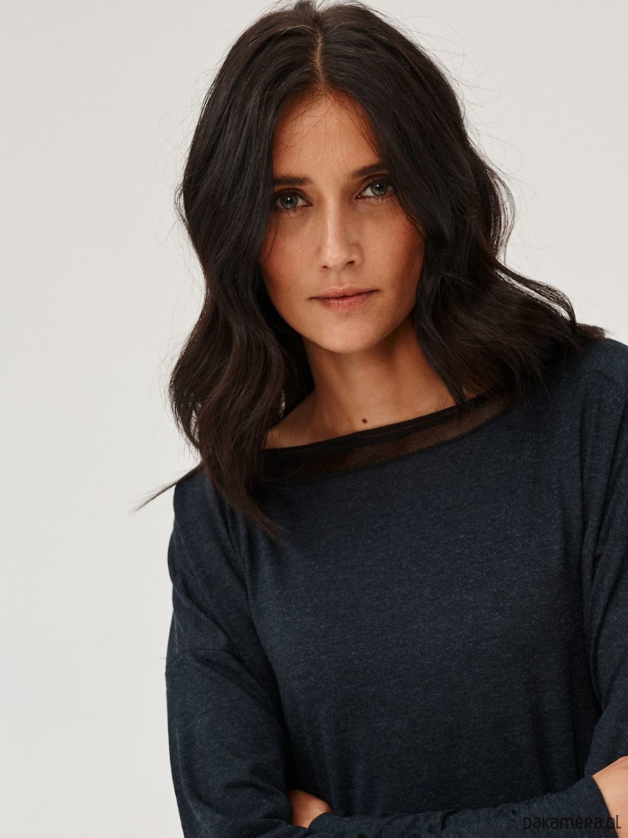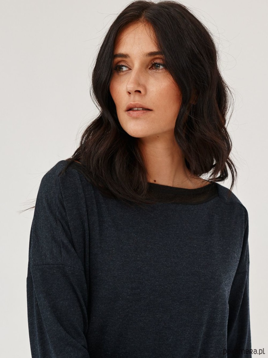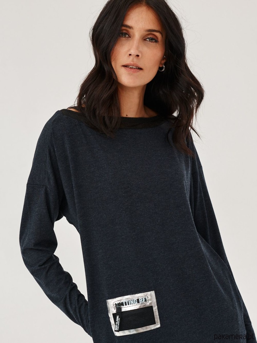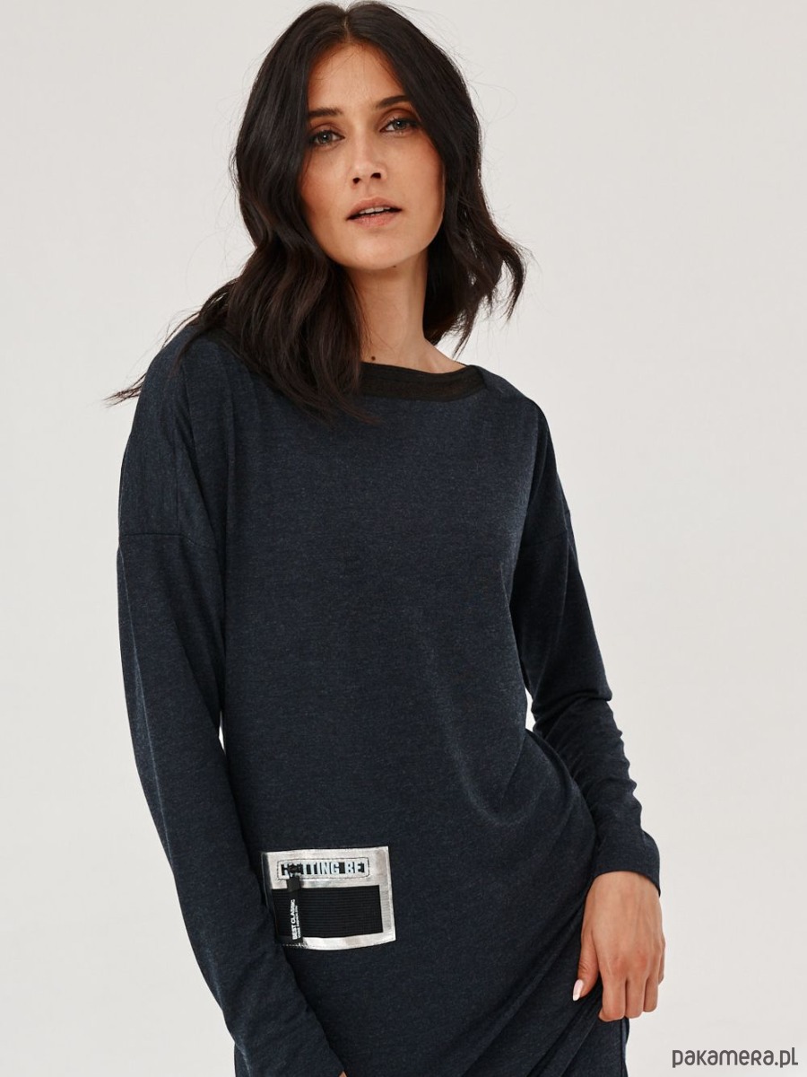Sukienka Afi uszyta jest z elastycznej dzianiny. Dzianina jest miękka i ciepła w dotyku, w kolorze melanżowego granatu z grafitem. Forma sukienki jest lekko od ciała, co daje wiele możliwości stylizacji. Ponadto sukienka ma oczywiście kieszenie. Na przodzie efektownym akcentem jest Srebrna kieszonka z siateczką. Szyja w kształcie łódzki, wykończona czarną pliską.