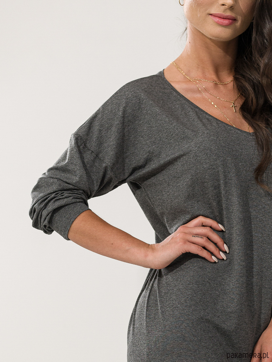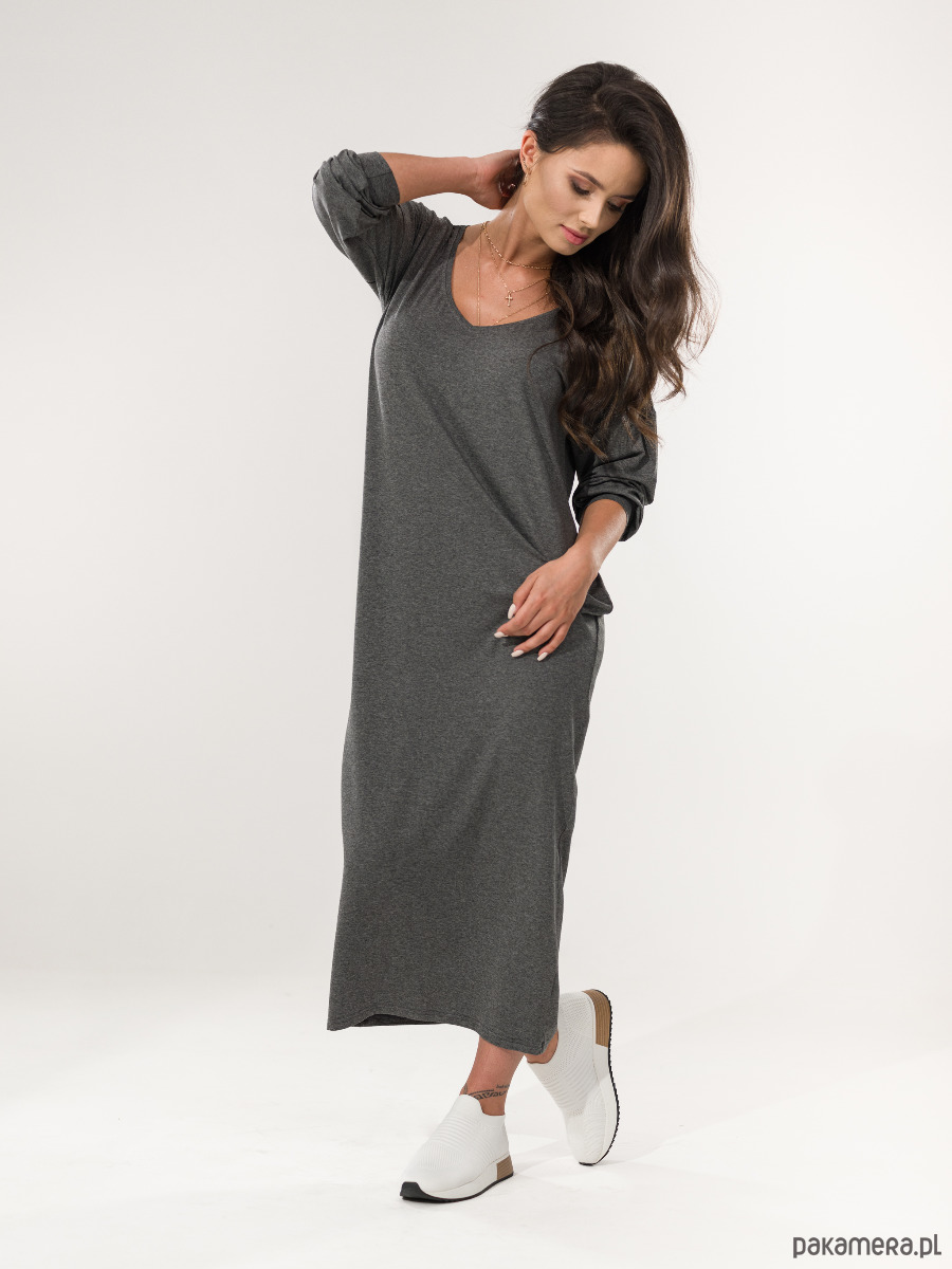 Bardzo wygodna długa sukienka z cienkiej dzianiny. Długi rękaw zakończony ściągaczem. Krój z obniżonym rękawem. Sukienka jest luźna, bluzowa zwęża się na dole. Dekolt w duże V.