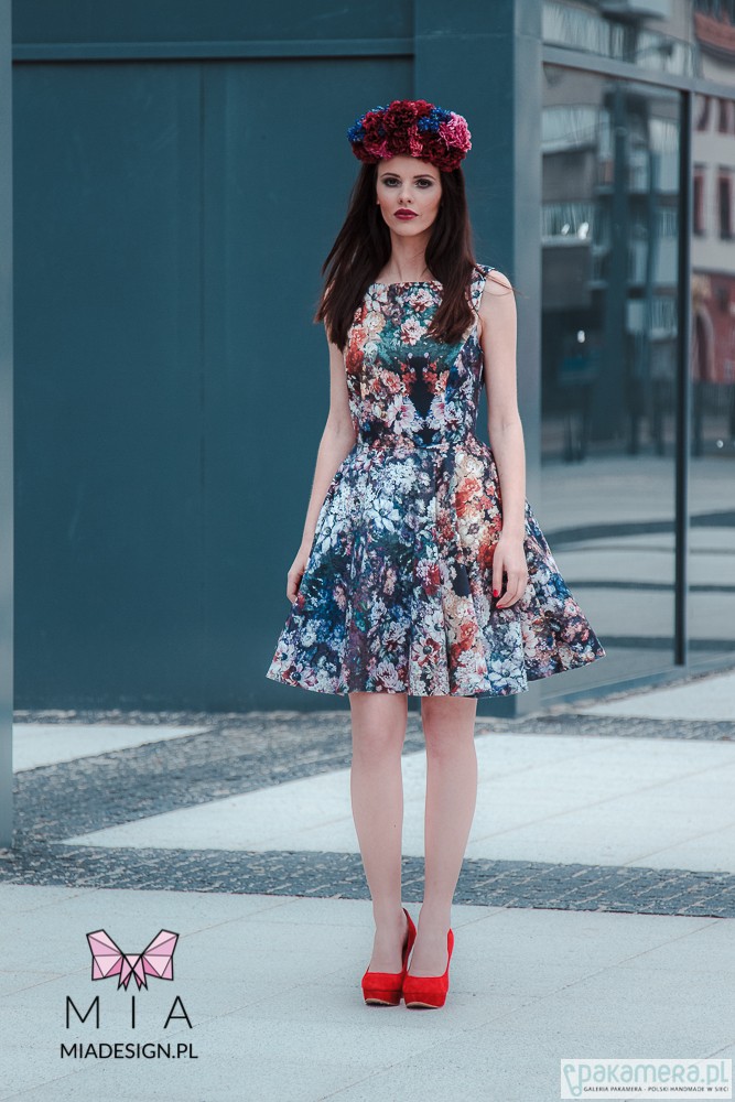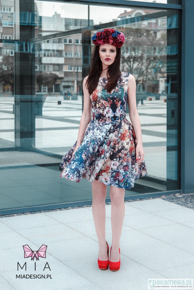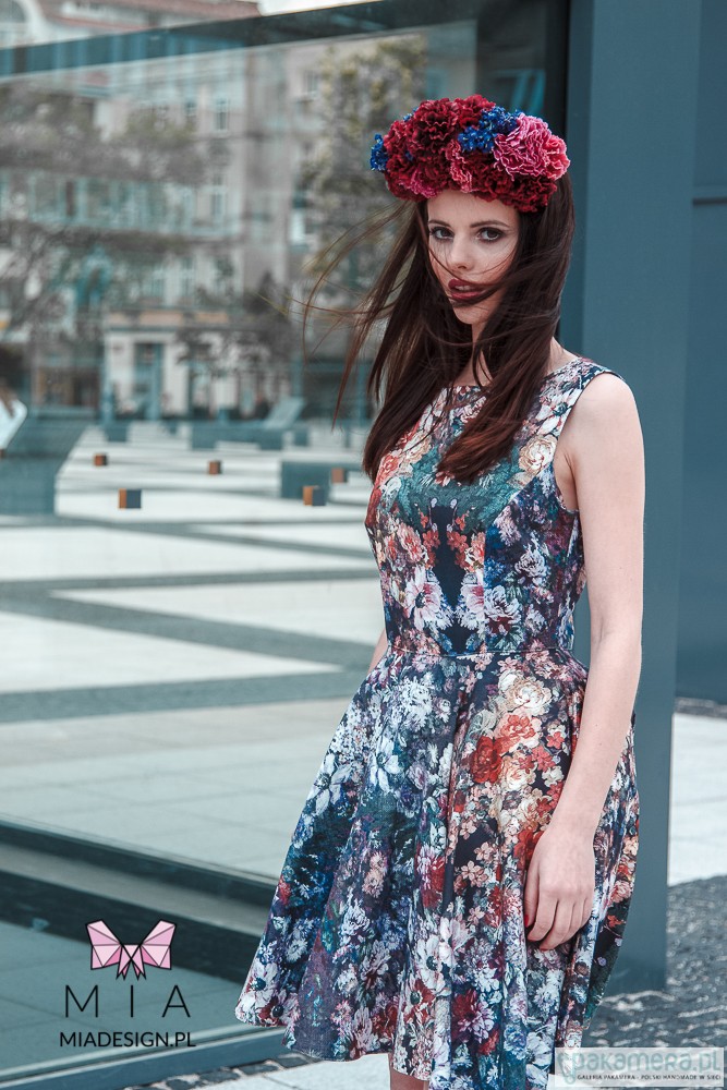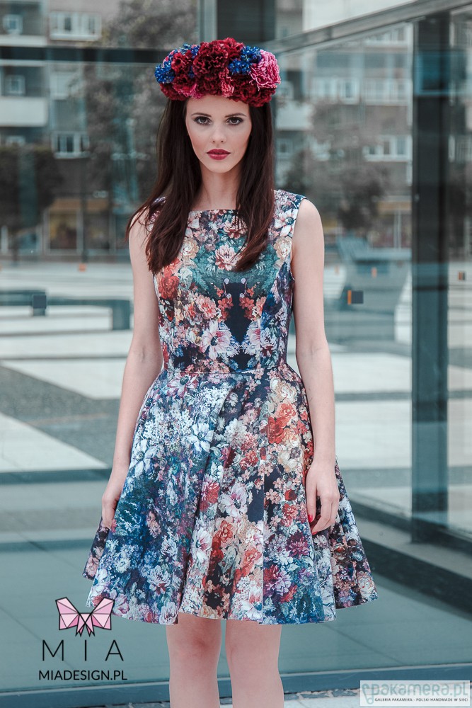 Rozkloszowana sukienka w kwiaty, na bazie koła. Dominujące kolory kwiatów to nasycony fiolet, róż oraz czerwień projektu Mia Design. Dostępne rozmiary: S, M, L Skład:bawełna 100% Wymiary: S Obwód w biuście: 86-90cm Obwód w talii: 65-70cm Długość: 80cm M Obwód w biuście: 92-98cm Obwód w talii: 68-76cm Długość: 89cm L Obwód w biuście: 98-104cm Obwód w talii: 74-82cm Długość: 90cm