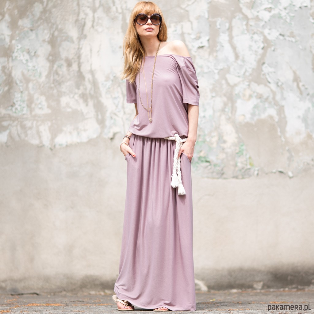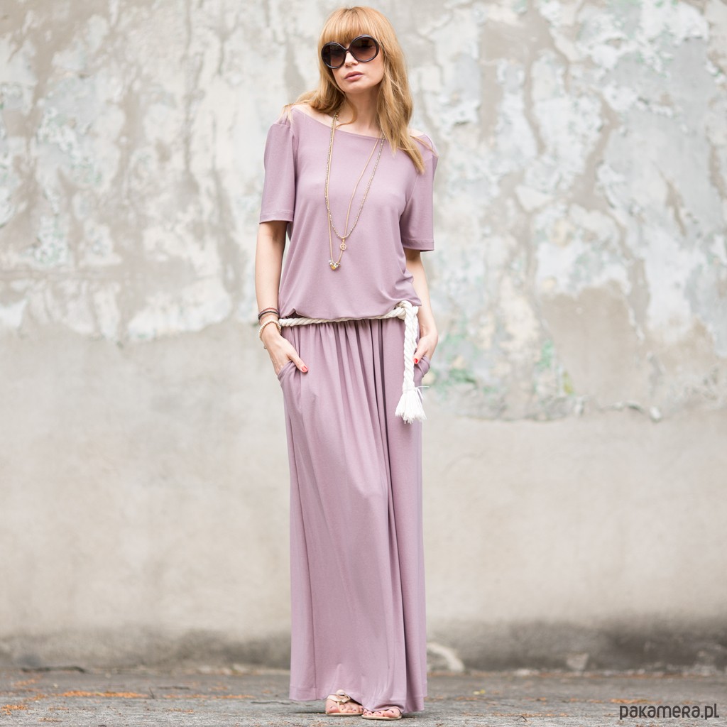 Niesamowita boho maxi w odcieniu pastelowego brudnego różu , uszyta z elastycznej dzianiny "Venge" , guma w pasie - możliwość regulacji długości sukienki - gumę w zależności od potrzeb możemy ułożyć w pasie lub na biodrach kieszenie , z tyłu pięknie bluzujący się dekolt , dostępna w jednym rozmiarze "one size", pasek widoczny na zdjęciu nie jest dołączony do sukienki ale można go również zakupić w naszym butiku