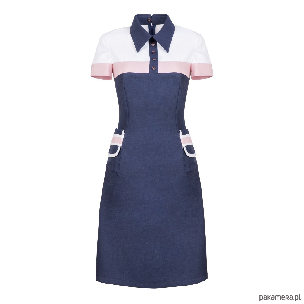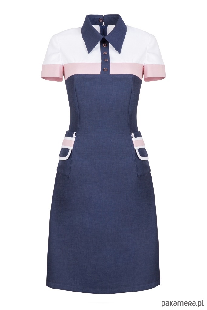 Granatowa sukienka z kołnierzykiem z lekko podniesioną talią podkreśla i wysmukla kobiecą sylwetkę, a dzięki ozdobnym kieszeniom w subtelny sposób odsłania atuty kobiecego ciała. Połączenie koloru granatowego z białym i różowym daje szerokie możliwości w doborze dodatków i akcesoriów, dzięki czemu zakup przestaje być zakupem „na jeden raz”. Sukienkę można nosić wraz z butami na wysokim obcasie, jak również do butów sportowych.