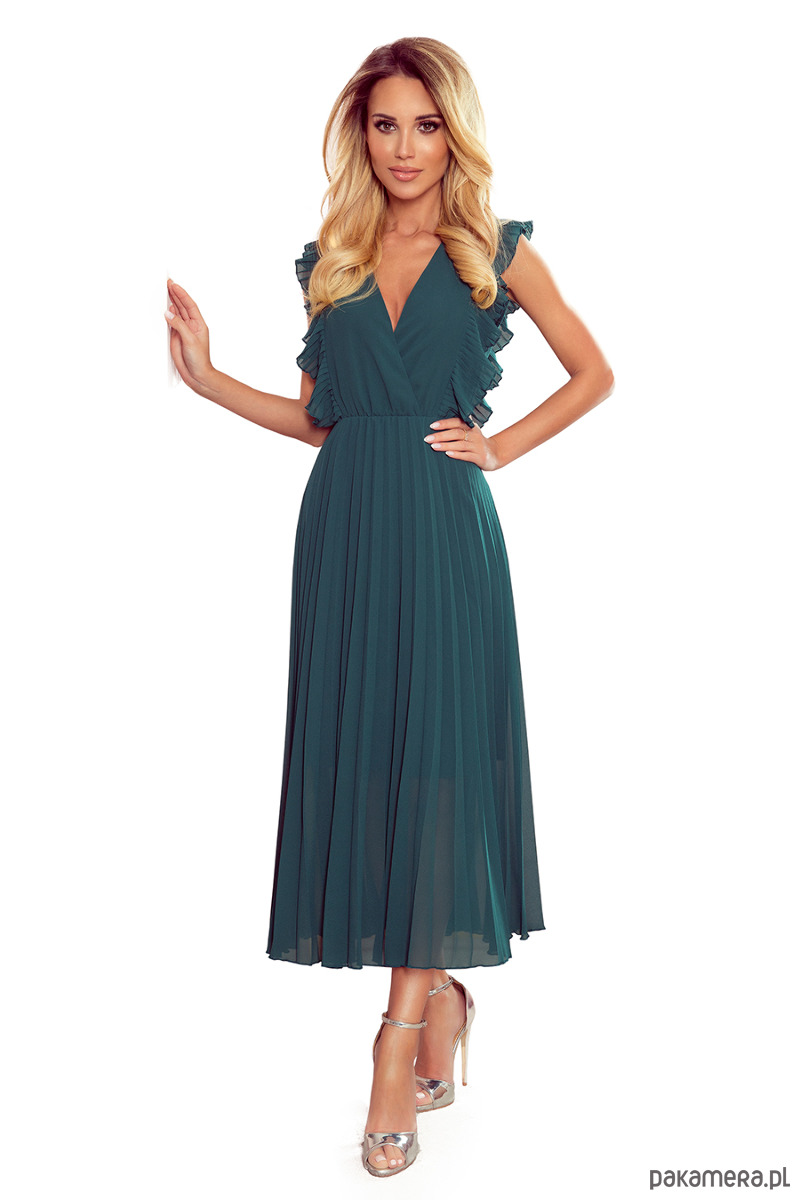 Emily - plisowana szyfonowa sukienka z dekoltem i falbankami. Spódnica została uszyta w modnej długości 7/8. Zapinana z tyłu na kryty zamek. Kolor: zieleń butelkowa. Marka numoco. Produkcja polska.