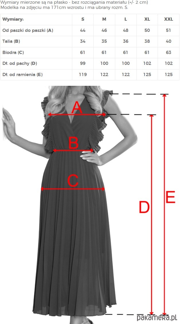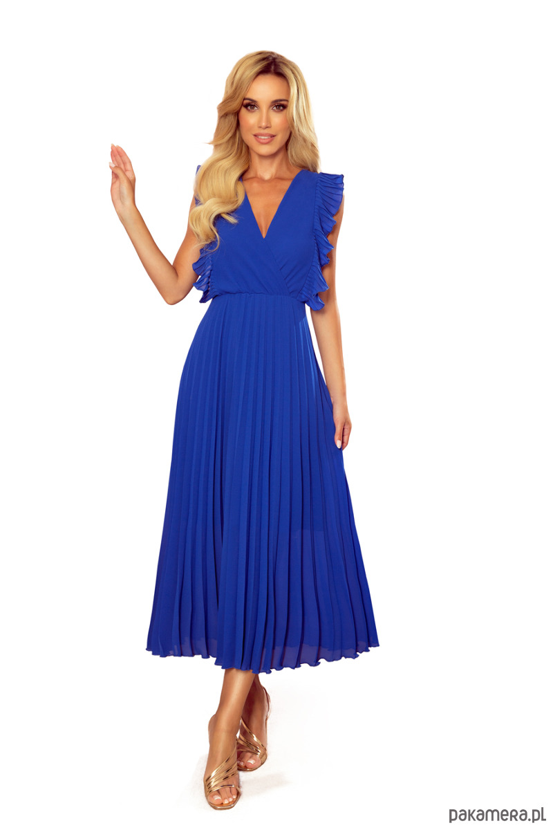 Emily - plisowana szyfonowa sukienka z dekoltem i falbankami. Spódnica została uszyta w modnej długości 7/8. Zapinana z tyłu na kryty zamek. Kolor: chabrowy. Marka numoco. Produkcja polska.