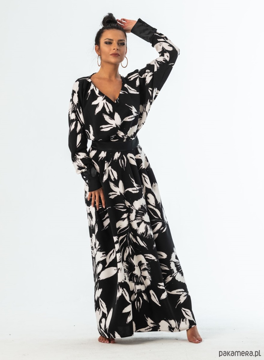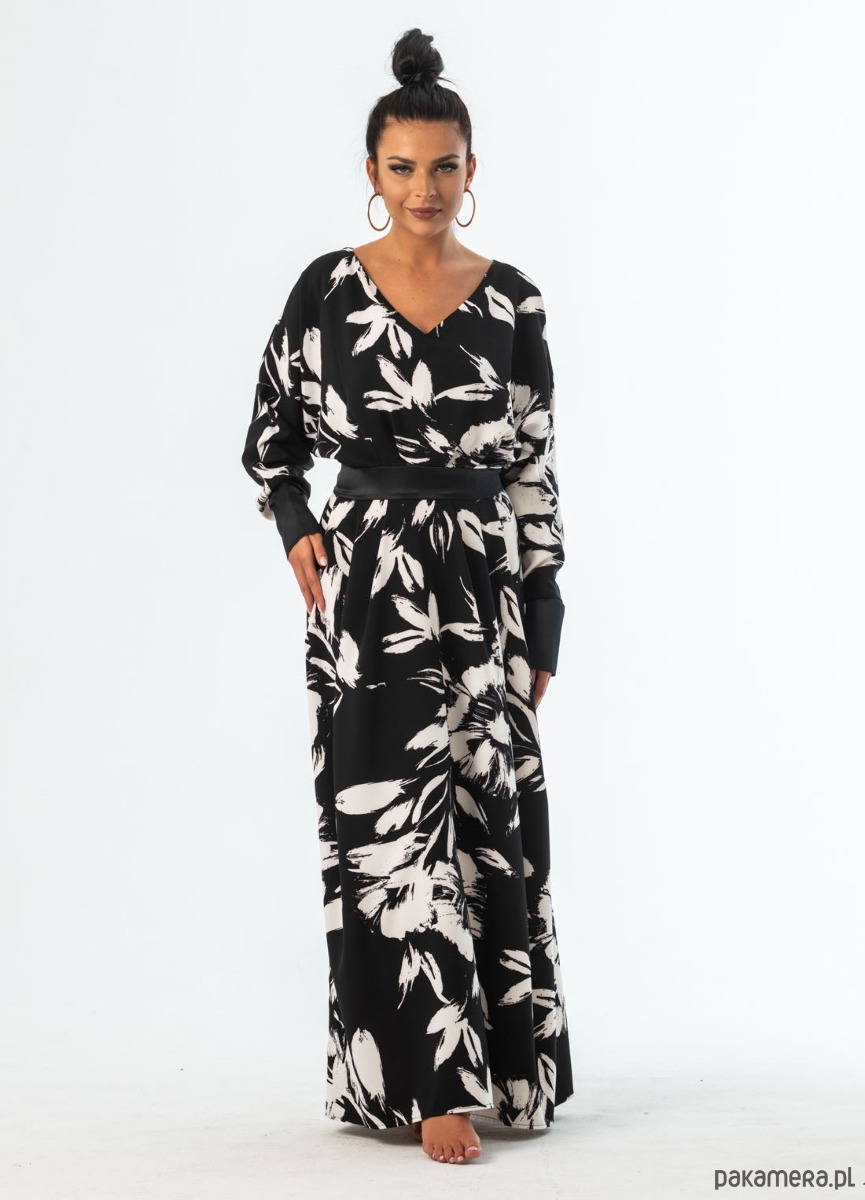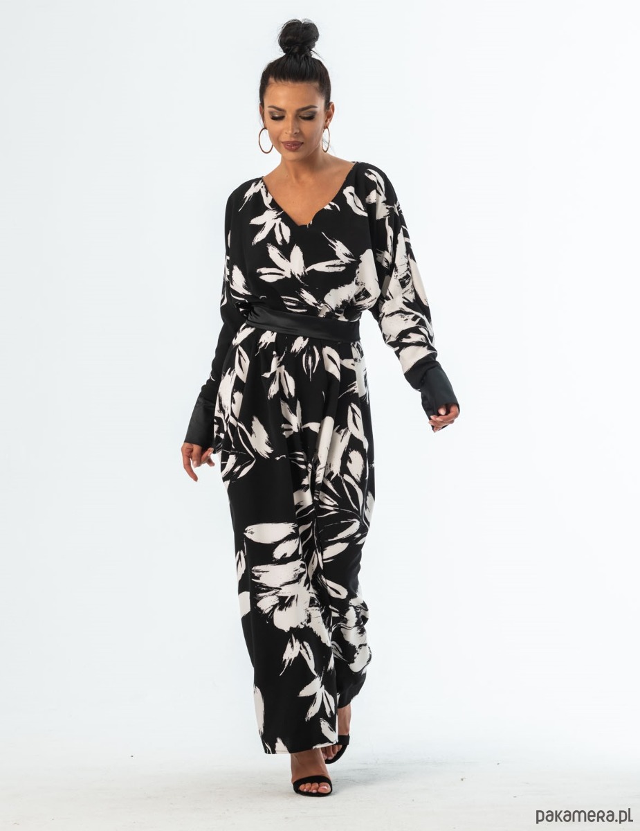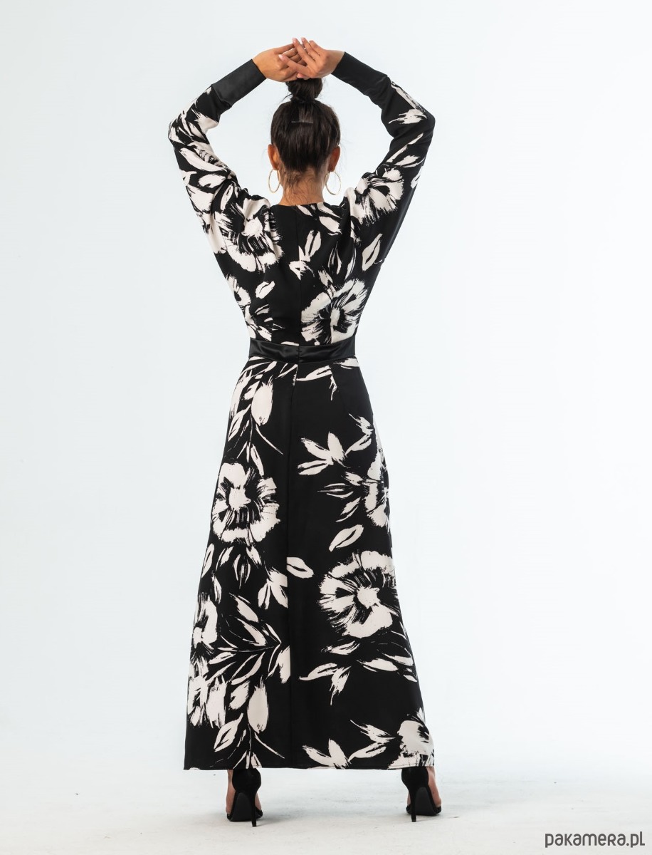 Biało czarna propozycja w duży kwiatowy wzór inspirowana modą japońską. Tkanina jest lekko elastyczna, niegniotąca, pięknie układa się na sylwetce. Długie, charakterystyczne, trójkątne rękawy oraz szeroki mankiet ozdobiony delikatnymi guzikami dodają jej eleganckiego charakteru. W talii oraz na mankietach zastosowano delikatnie połyskujący jedwab fantastycznie kontrastuje z matową tkaniną w malowane kwiaty. Z tyłu sukienka jest zapinana na kryty suwak. Idealna propozycja na jesienne dni. Uzupełniona o kardigan i zamszowe buty sprawdzi się na spacery i wyjścia. Jeżeli założymy do niej delikatne szpilki i prostą, geometryczną biżuterię mamy gotową stylizację na ważny wieczór.