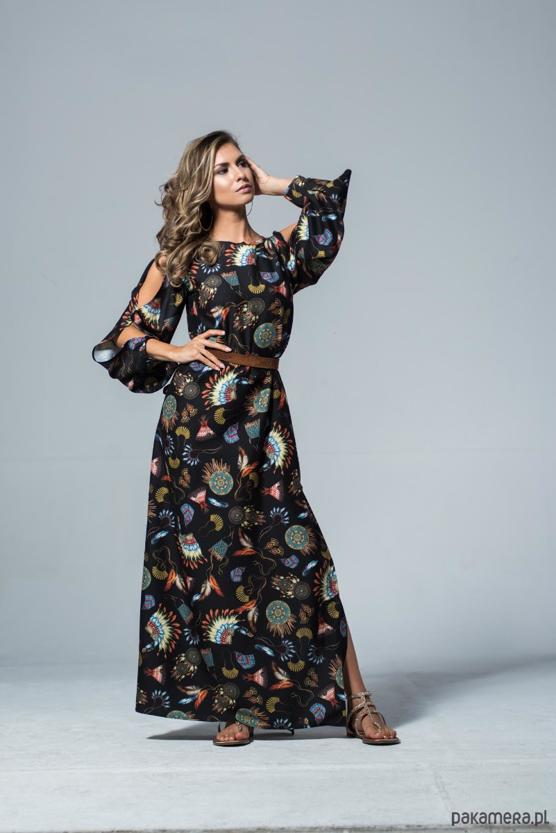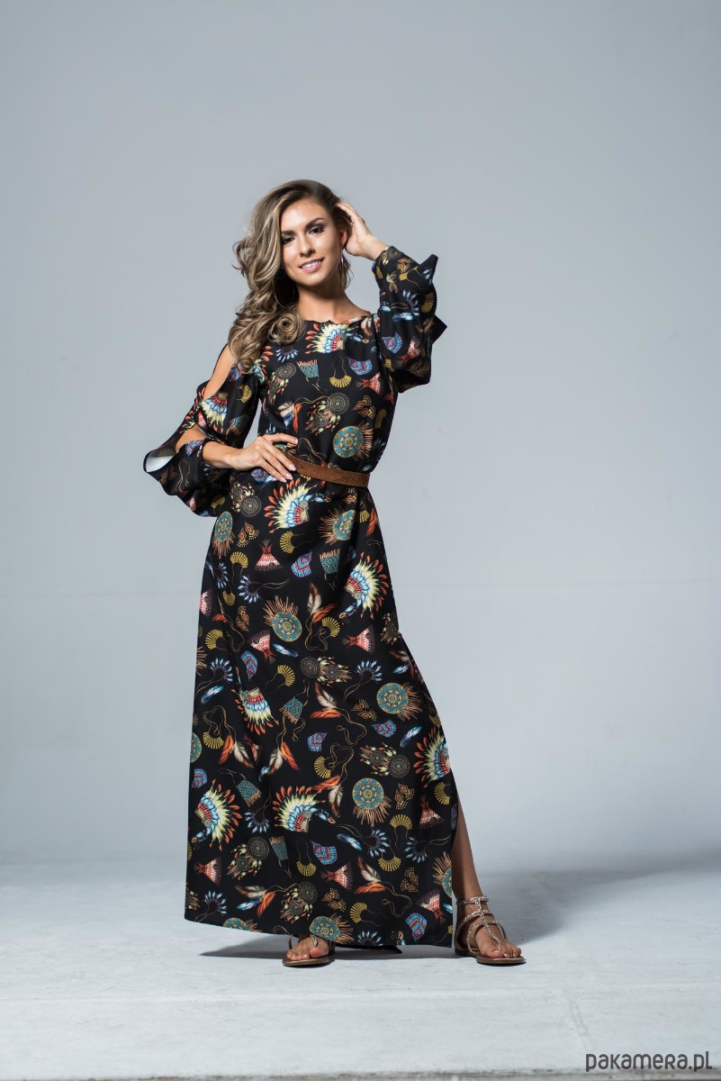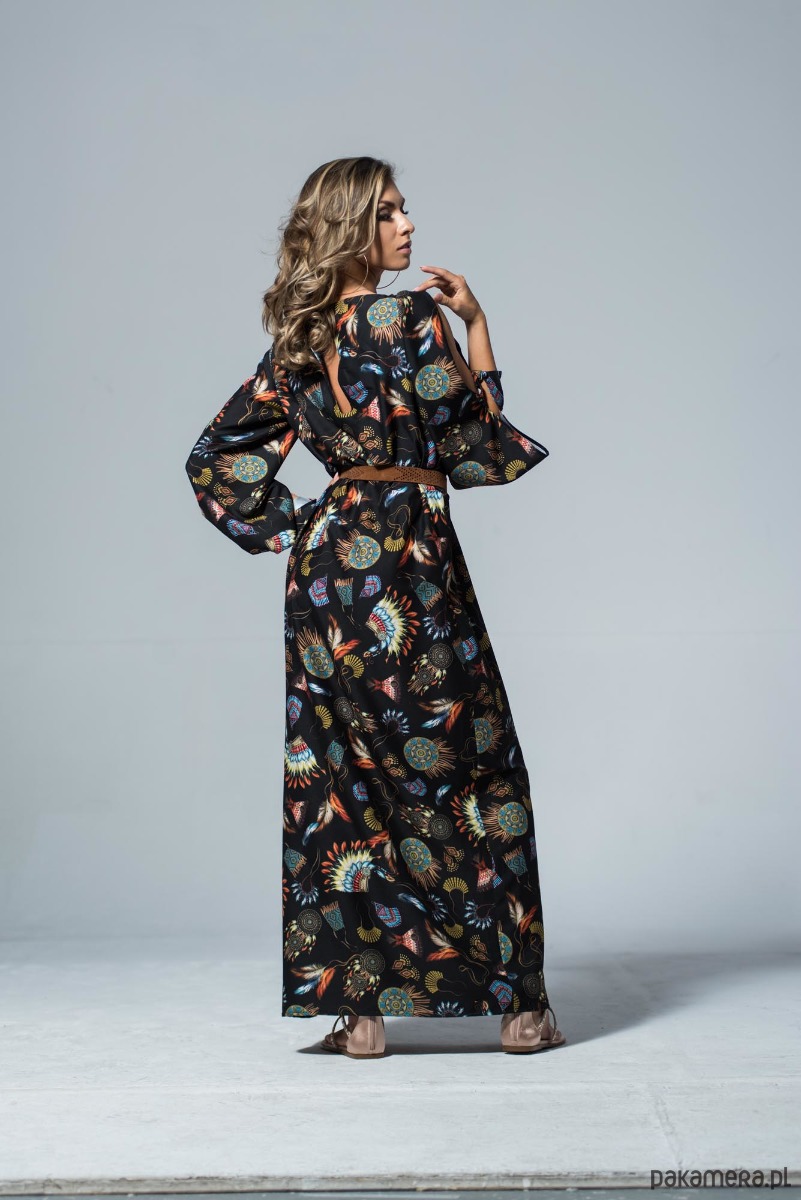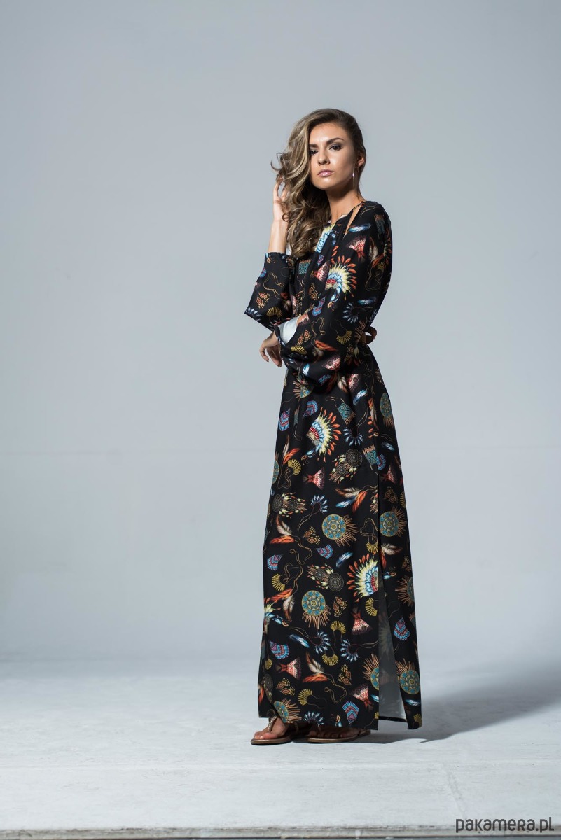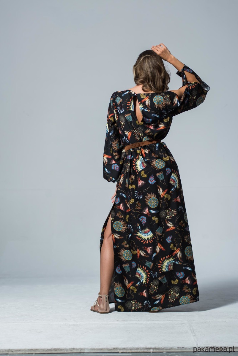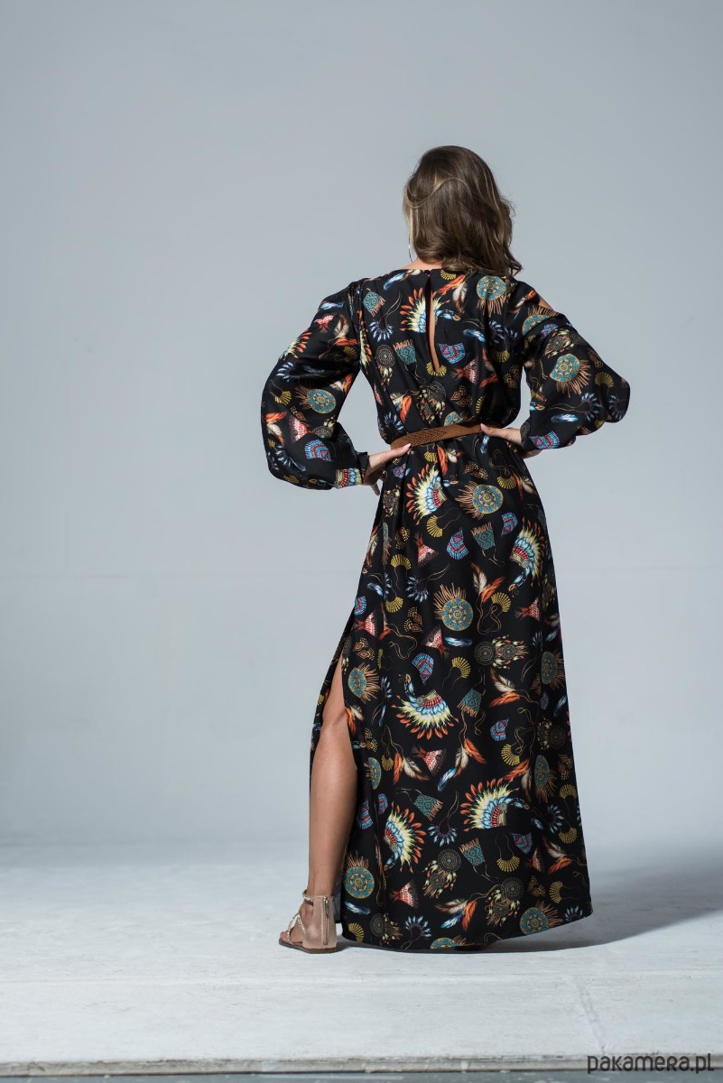 Długa wiązana w pasie sukienka z plecionym paskiem z rzemyka. Zwiewna sukienka w stylu boho. Indiańskie motywy na czarnym tle, podkreślają jej charakter, ale subtelne pęknięcia wzdłuż rękawów i powtórzenie tego akcentu na plecach czynią ją bardzo przewiewną a przy tym elegancką. Dzięki uniwersalnemu stylowi, można wykorzystać ten fason sukienki na wszelkie okazje. Z boku posiada rozcięcie z głęboką zakładką. Dzięki temu linia nogi jest widoczna jedynie podczas poruszania się. Zapinana z tyłu na guzik. Materiał odporny na zagniecenia. Skład tkaniny: poliester, akryl, bawełna. Można prać i prasować w niskiej temperaturze.