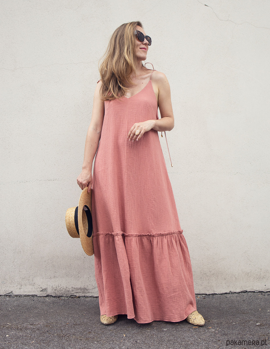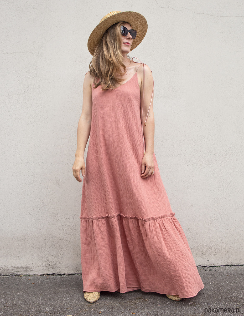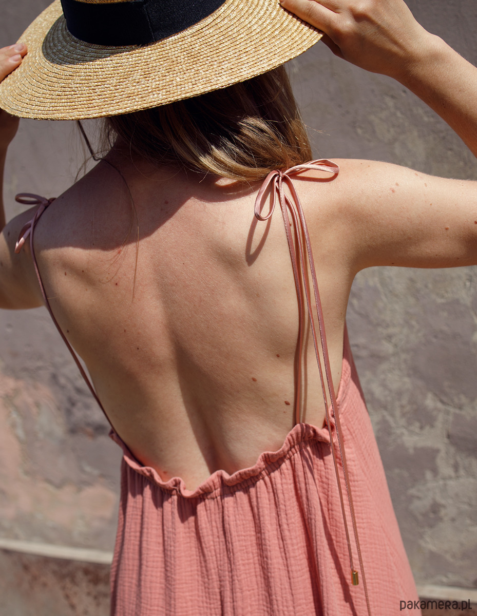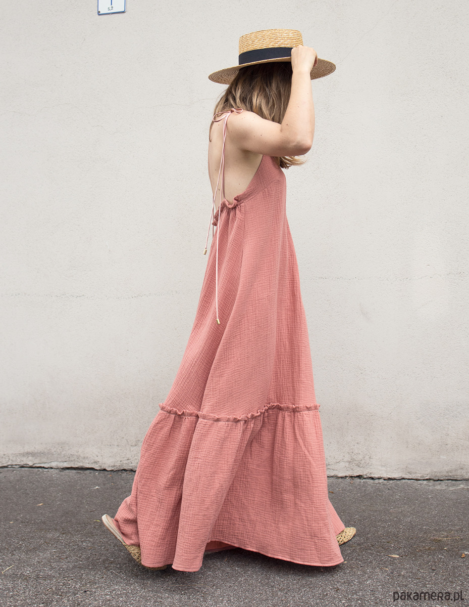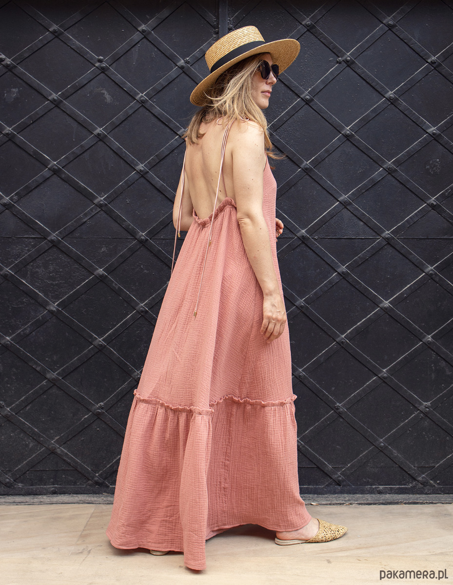 Zjawiskowa sukienka maxi z bawełnianego muślinu, w kolorze salomon. Idealna na lato, wakacyjne wycieczki, ale również śmiało można założyć ją na wesele czy inne letnie przyjęcie. Sukienka posiada wiązane ramiona, co pozwala na dostosowanie sukienki do wzrostu i regulację dekoltu. Można je wiązać na kilka różnych sposobów. Z tyłu odkryte plecy z wszytą gumką dzięki czemu dopasowuje się do sylwetki. Tkanina z certyfikatem oeko-tex.