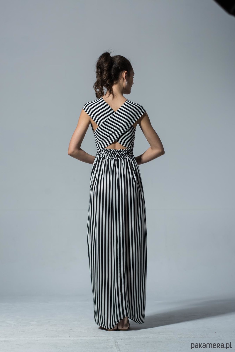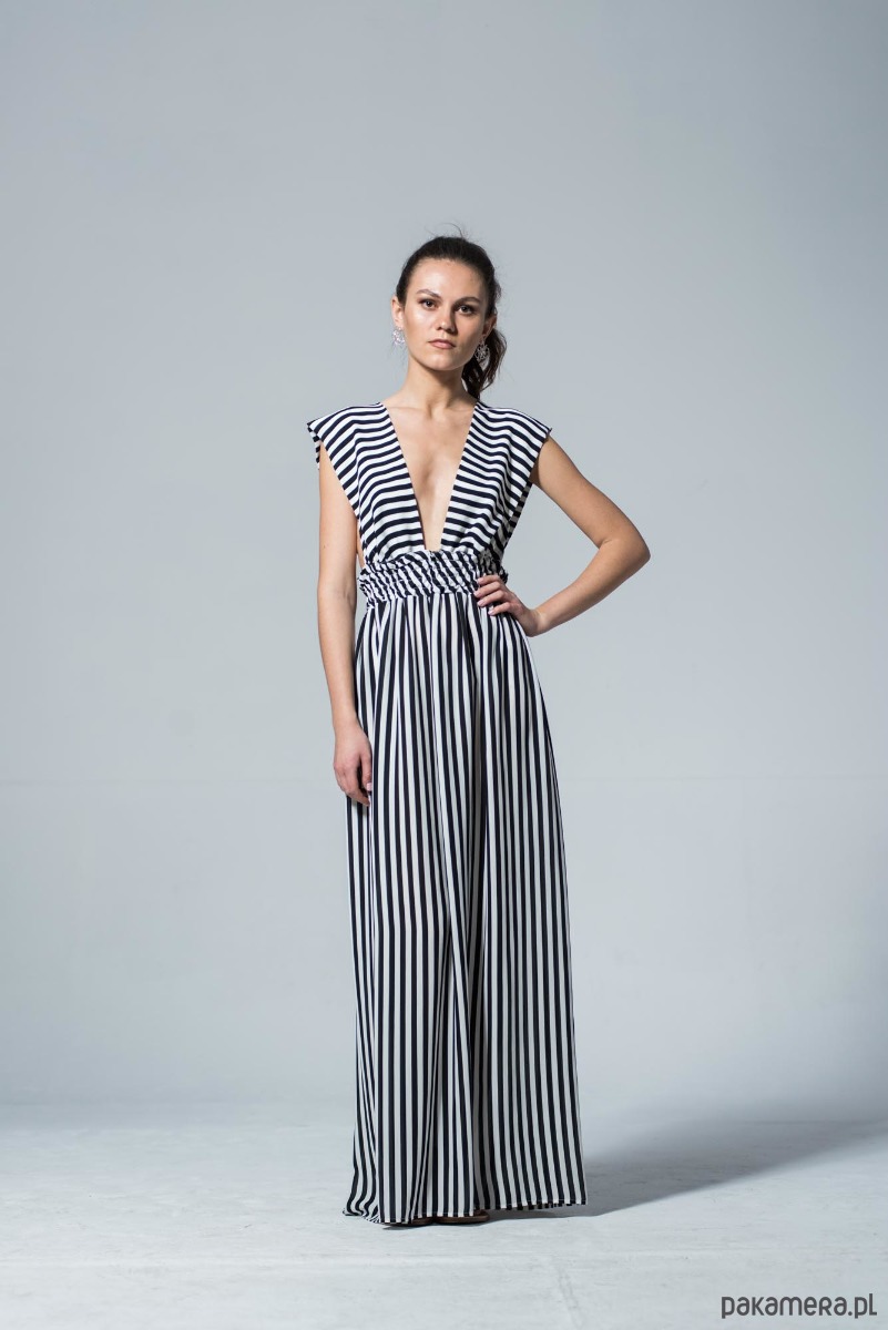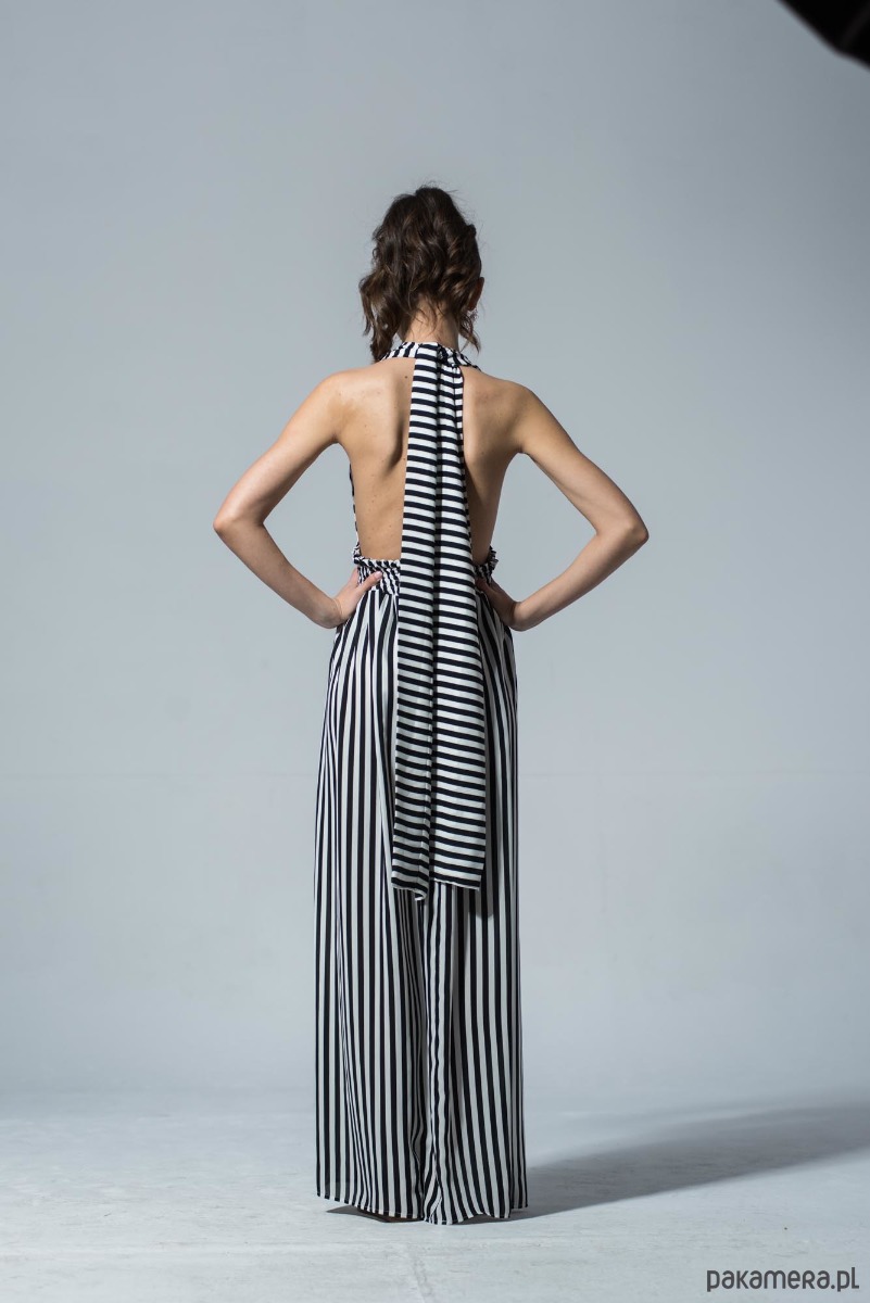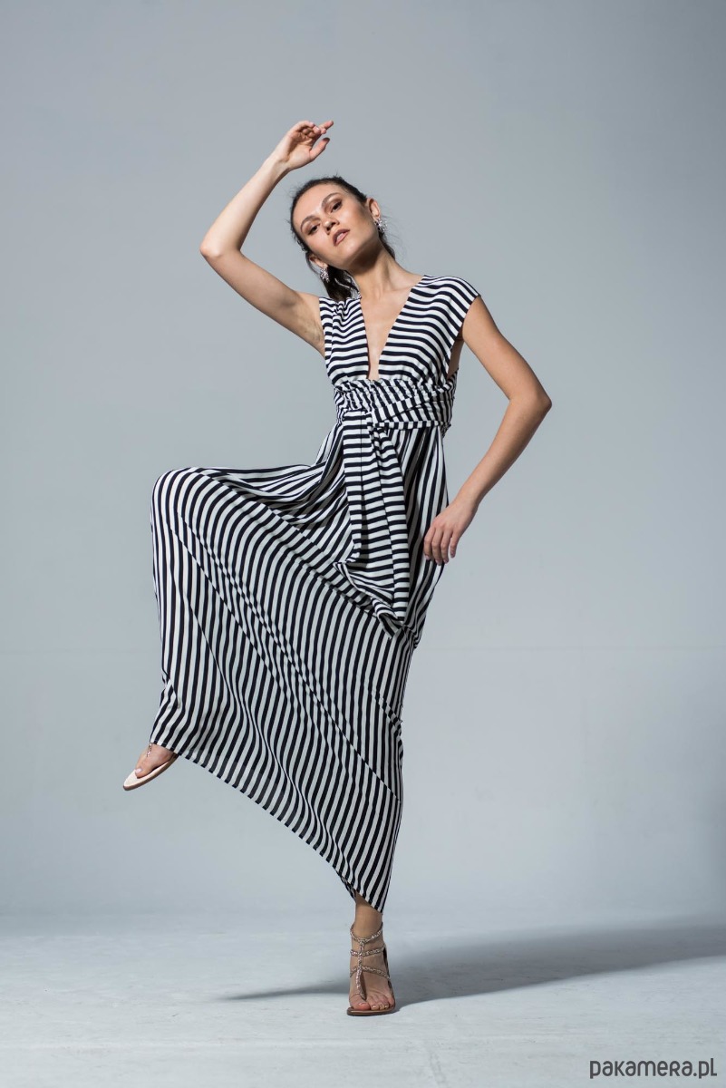 Zwiewna, szyfonowa propozycja sukienki na upalne dni. Klasyczny wzór w czarno białe pasy. Poprzez zastosowanie w spódnicy pasów pionowych pięknie wysmukla sylwetkę. Natomiast górna część w poprzeczne pasy daje efekt powiększenia biustu i zrównoważenia sylwetki. Sukienka zebrana grubą gumą w linii talii, która jest doszyta do materiału co zapobiega jej skręcaniu się. Górną cześć sukienki można dowolnie stylizować. Z tyłu na linii bioder sukienka posiada elastyczną szlufkę przez którą można przepuścić dwie górne szarfy sukni i dodatkowo zapiąć na dwa guziki, aby pasy materiału nie wysuwały się. . Można je również swobodnie zawiązać z tyłu na szyi lub po przełożeniu z tyłu na krzyż przewiązać w talii. Oryginalna propozycja dla nietuzinkowej osobowości. Tkanina 100% poliester. Można prać w 40% i prasować w niskiej temperaturę max 110%.