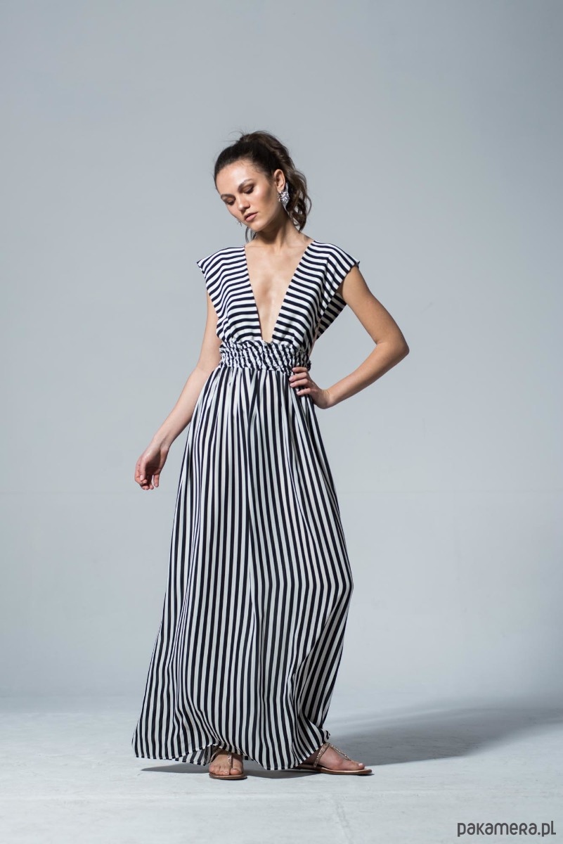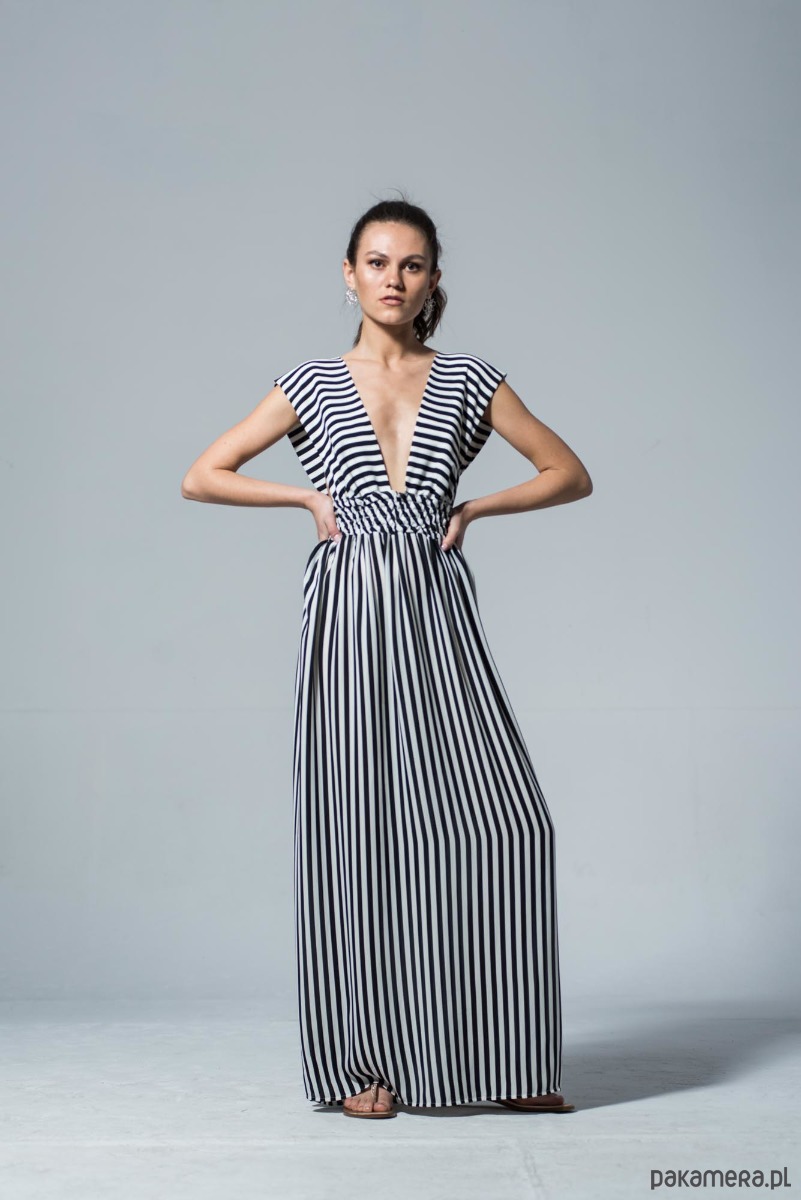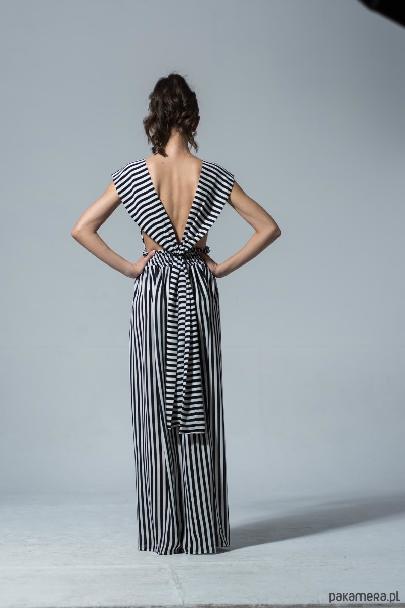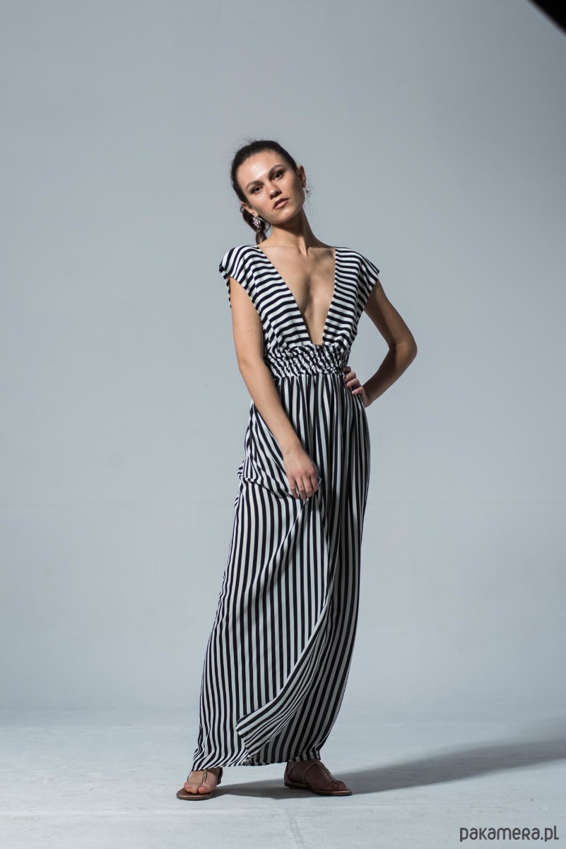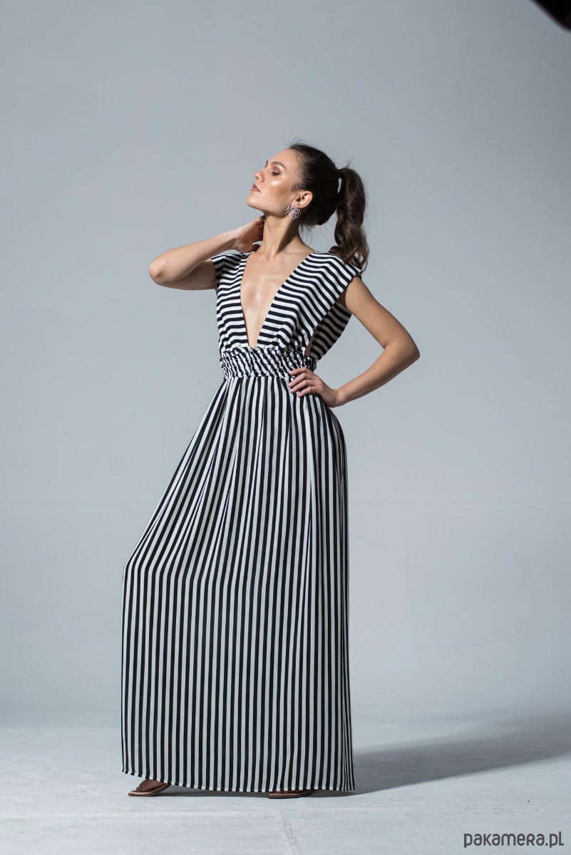 Zwiewna, szyfonowa propozycja sukienki na upalne dni. Klasyczny wzór w czarno białe pasy. Poprzez zastosowanie w spódnicy pasów pionowych pięknie wysmukla sylwetkę. Natomiast górna część w poprzeczne pasy daje efekt powiększenia biustu i zrównoważenia sylwetki. Sukienka zebrana grubą gumą w linii talii, która jest doszyta do materiału co zapobiega jej skręcaniu się. Górną cześć sukienki można dowolnie stylizować. Z tyłu na linii bioder sukienka posiada elastyczną szlufkę przez którą można przepuścić dwie górne szarfy sukni i dodatkowo zapiąć na dwa guziki, aby pasy materiału nie wysuwały się. . Można je również swobodnie zawiązać z tyłu na szyi lub po przełożeniu z tyłu na krzyż przewiązać w talii. Oryginalna propozycja dla nietuzinkowej osobowości. Tkanina 100% poliester. Można prać w 40% i prasować w niskiej temperaturę max 110%.