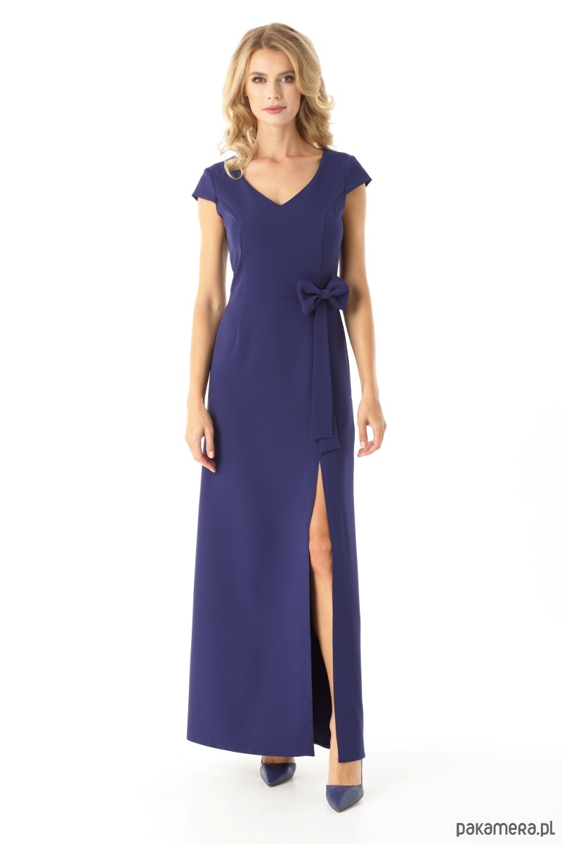 Długa elegancka prosta sukienka z rozcięciem z boku i kokardą. Górna część sukienki dopasowana z dekoltem w kształcie serca i krótkim rękawkiem. Fason idealny na ważne uroczystości.