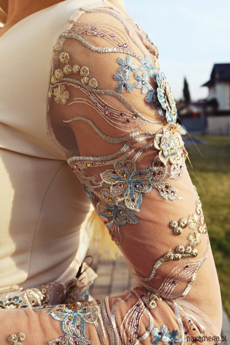 kolor: jasny beż, halka ze zdobieniami w jasnych odcieniach błękitu oraz złota.