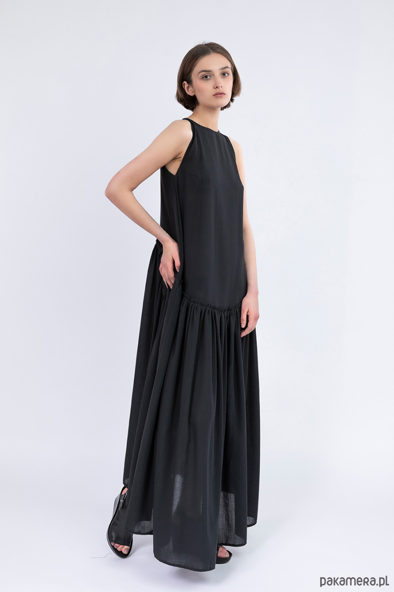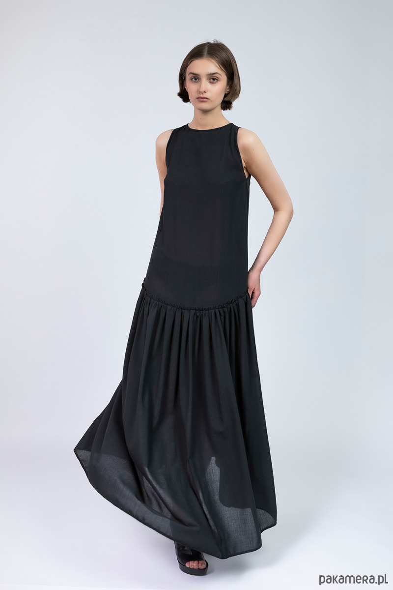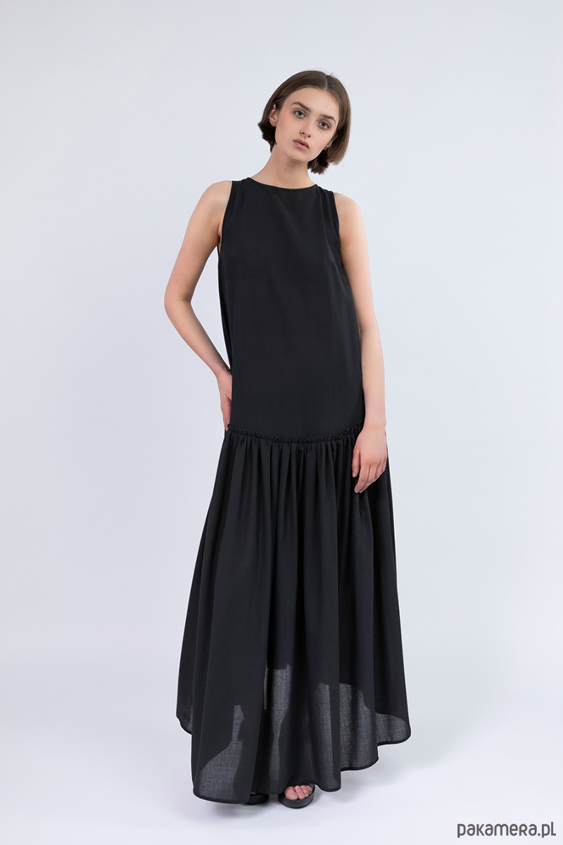 sukiena uszyta ze lnu lub z bawełny cienkiej z elastanem, z dekoracyjną falbaną szeroką wszyta ukośnie,