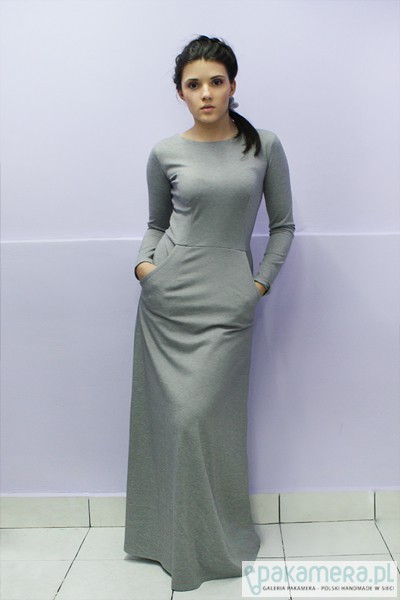 Klasyczna, bardzo prosta w formie długa sukienka. Uszyta z grubego mięsistego jerseyu. Projekt mniej zobowiązujący, posiada wygodne kieszenie. Sukienka dopasowana, poniżej linii bioder się rozszerza. Długość całkowita 106cm. Na zamówienie można zmienić kolor oraz długość sukienki. Z tyłu delikatny dekolt. Polecam na wiele okazji. Wymiary kobiet: biust talia biodra (w cm): 34 -- 80 62 86 36 -- 85 70 90 38 -- 89 74 95 40 -- 93 78 98