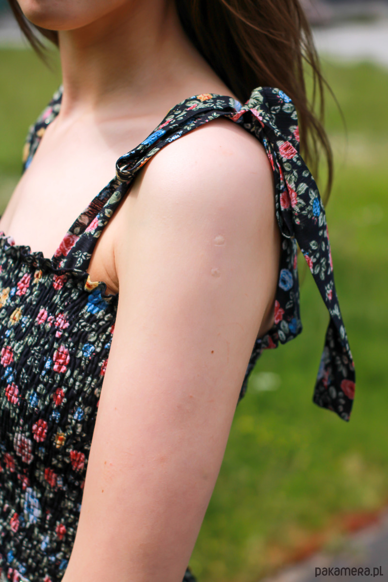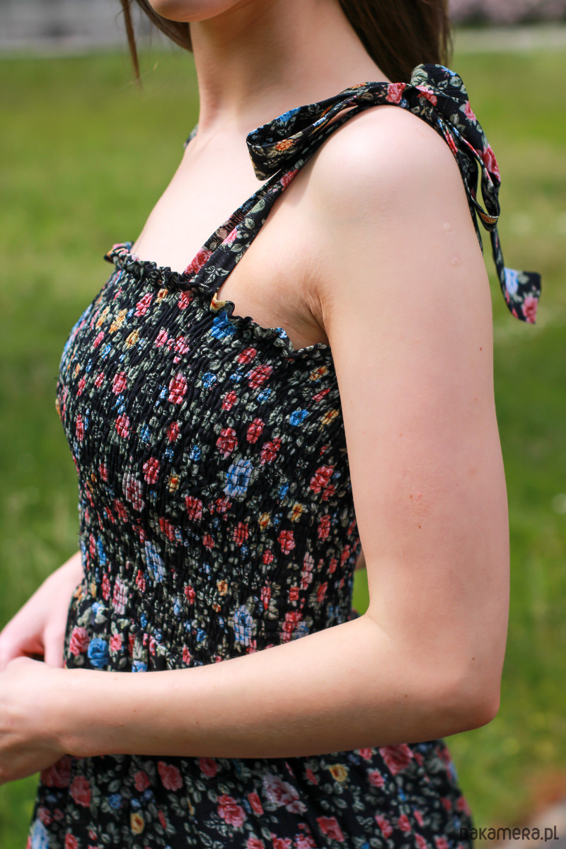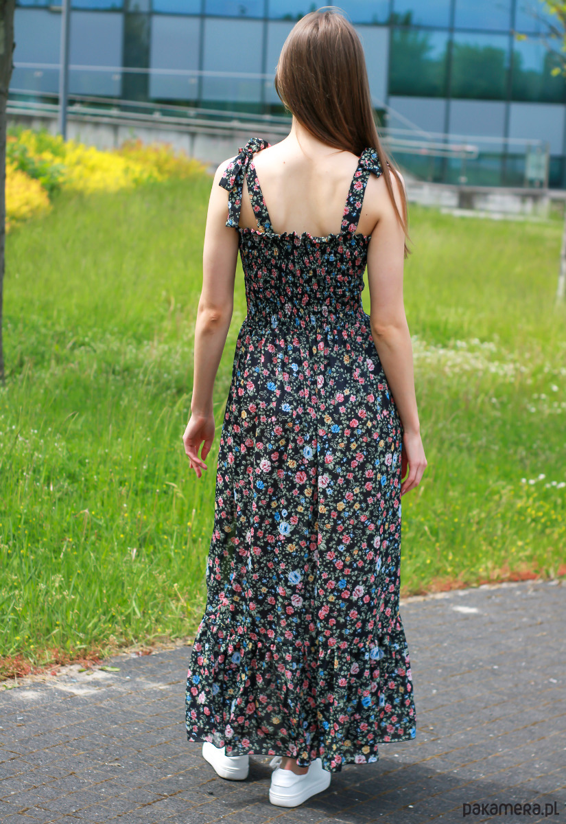 Najmodniejsza w tym sezonie, długa sukienka maxi w kwiatki. Góra sukienki została wykonana gumowanymi elastycznymi nićmi. Dół sukienki lekki, zwiewny z głębokim rozporkiem na nodze, wykończona falbaną. Idealna na upalne dni. Wszystkie nasze ubrania szyjemy we własnej szwalni w Poznaniu.