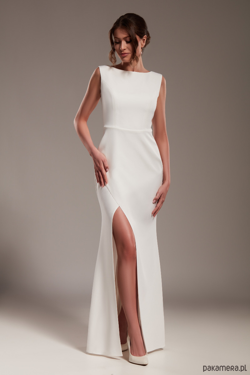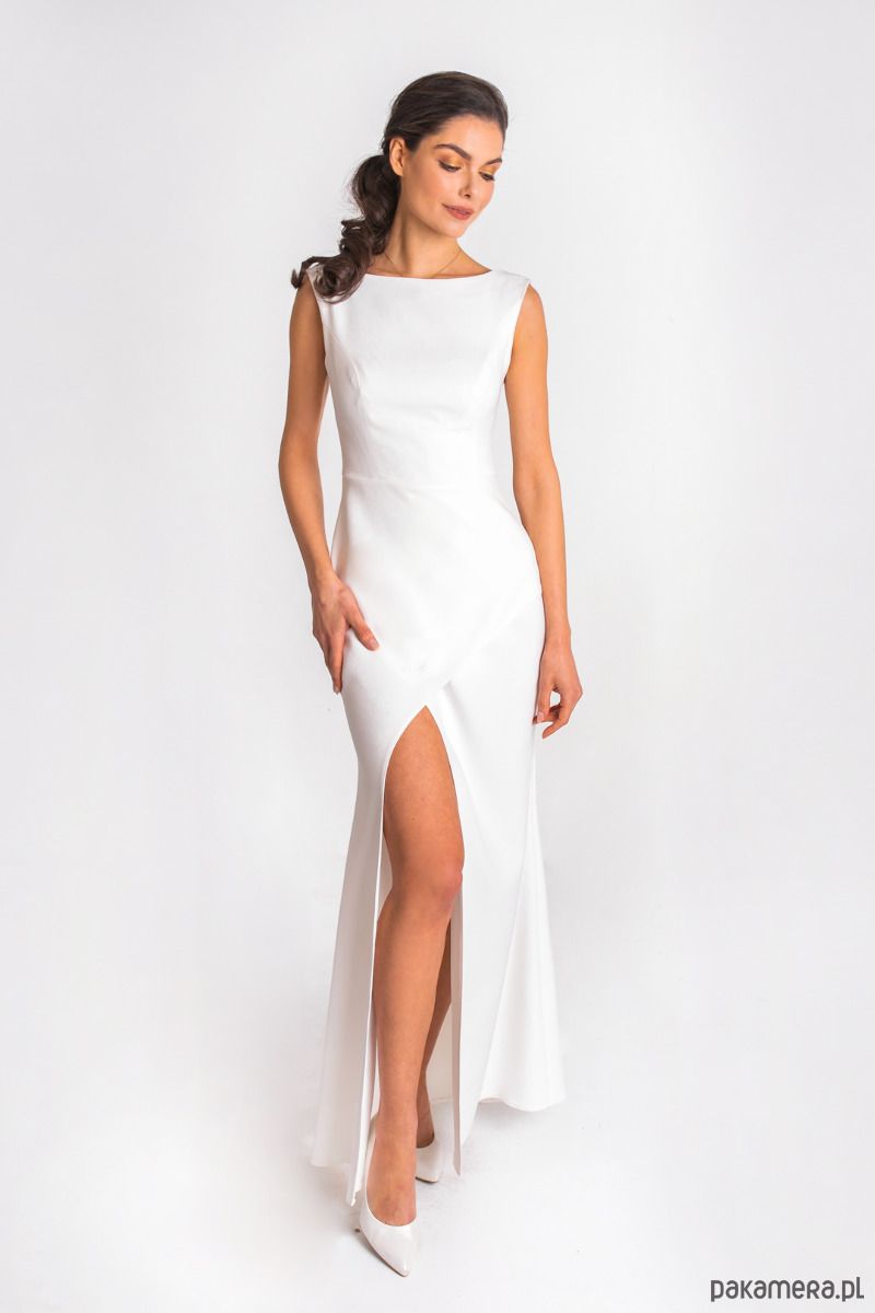 Minimalistyczna, kobieca, sukienka z dekoltem w kształcie łódki. Z tyłu zapinana na kryty zamek.