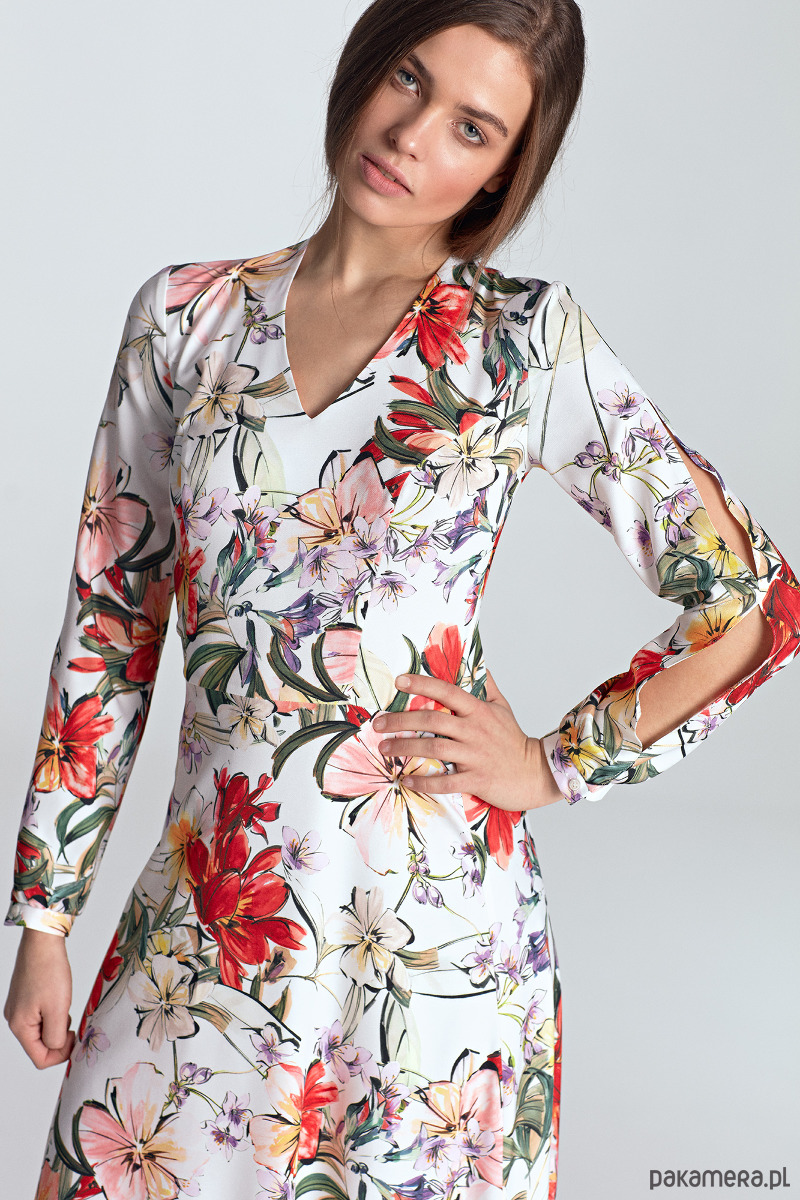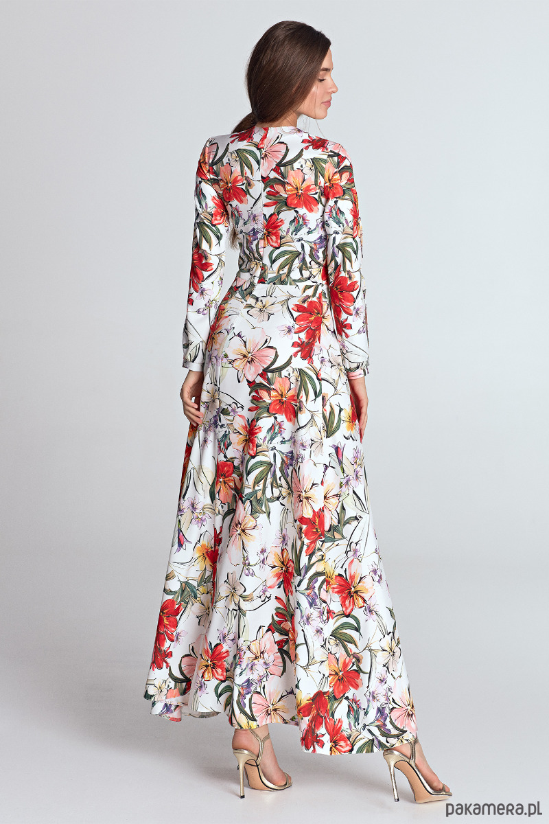 Hit kolekcji wiosna/lato 2019. Sukienka maxi z długim rękawem i oryginalnymi wiązaniami na rękawach. Model idealnie dopasowuje się do górnej części ciała, podkreślając jego atuty. Dekolt w kształcie litery V. Dolna część sukienki rozkloszowana.
