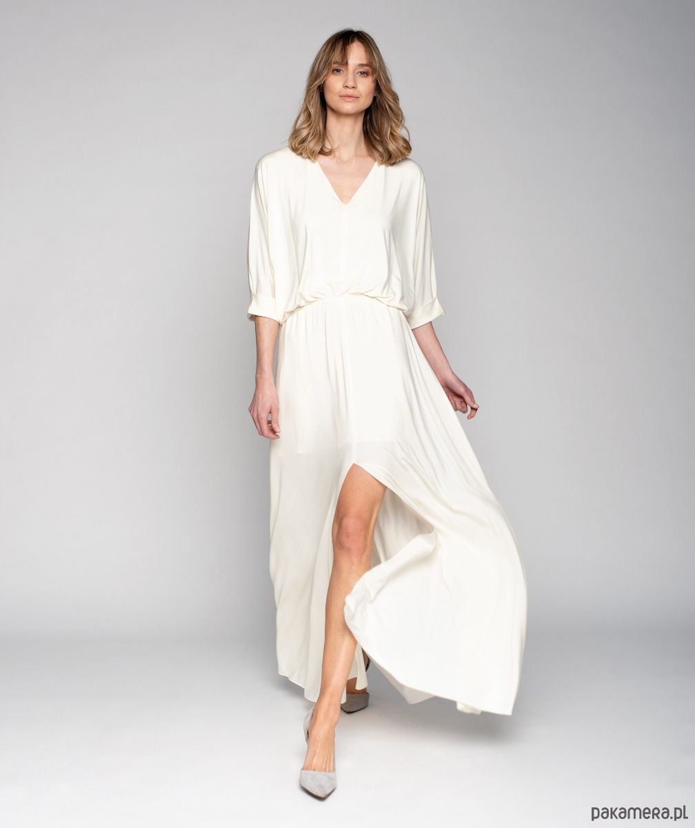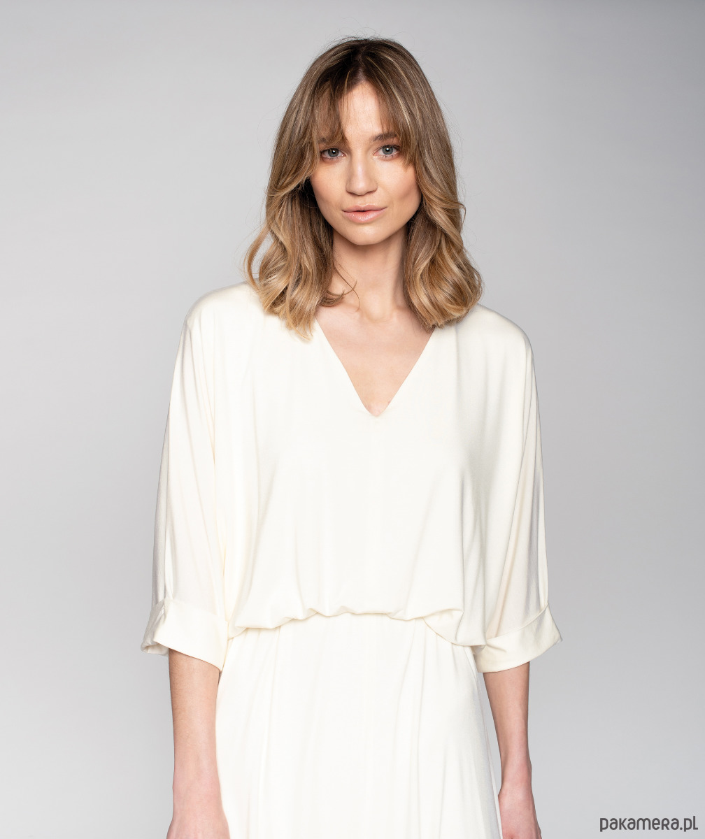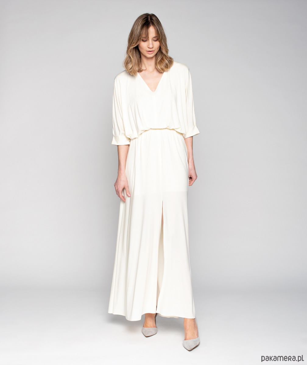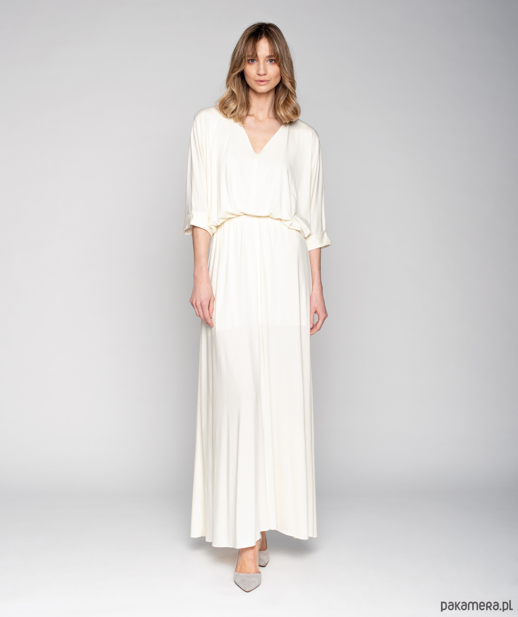 Delikatne marszczenie nadaje jej lekkości. Gumka w pasie daje możliwość idealnego dopasowania w talii. Ma prosty kimonowy rękawy wykończony mankietem. Suknia może być suknią ślubną, zwiewna, połyskliwa dzianina nadaje jej elegancji.