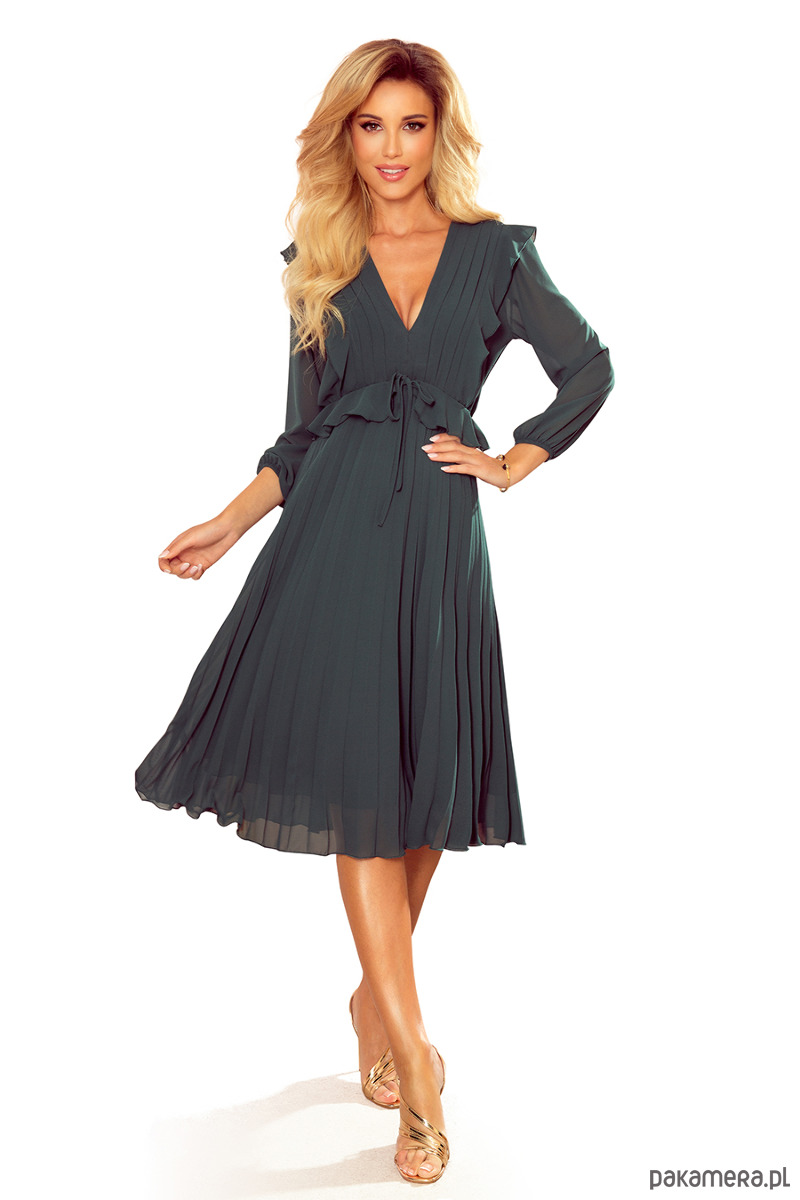 Polly - Szyfonowa sukienka z plisami i falbankami. Kolor: zieleń butelkowa. Produkcja polska. Marka Numoco.