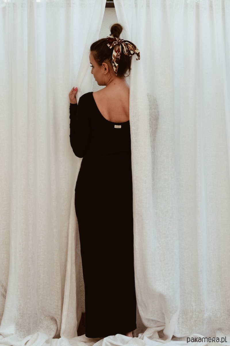 Długa suknia z rozporkiem na boku. Możesz wybrać wycięcie na plecach: wycięcie do wysokości biustonosza lub mocno wycięte prawie do pasa (zdjęcie na plaży). Materiał rozciąga się o ok 4 cm na szerokość.