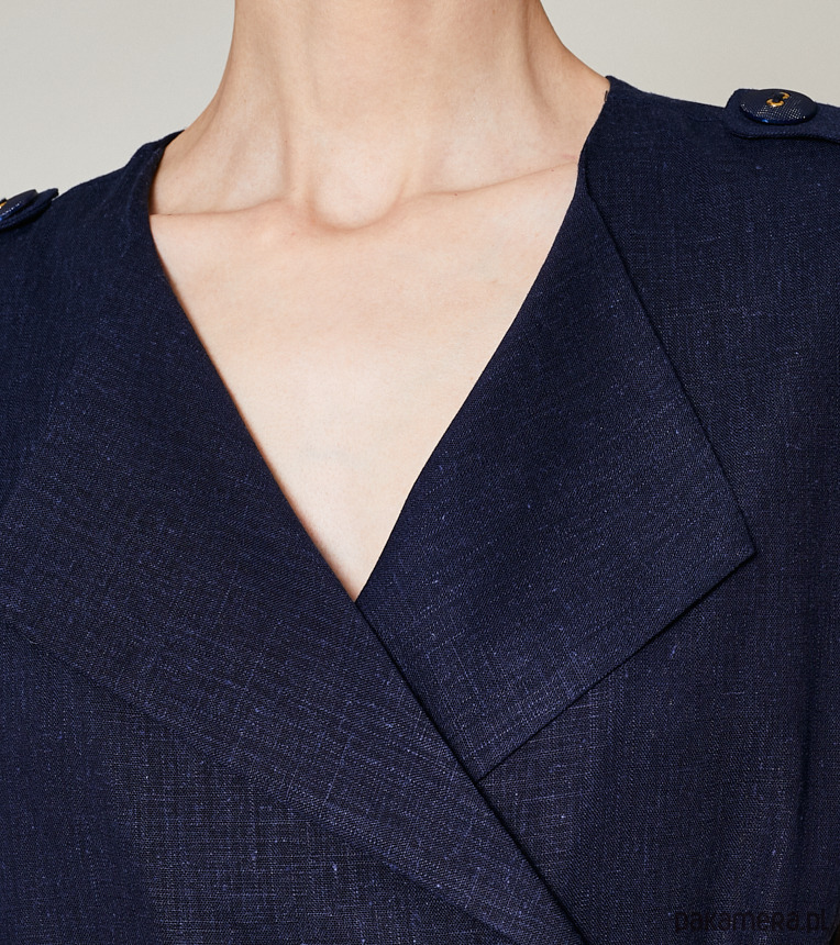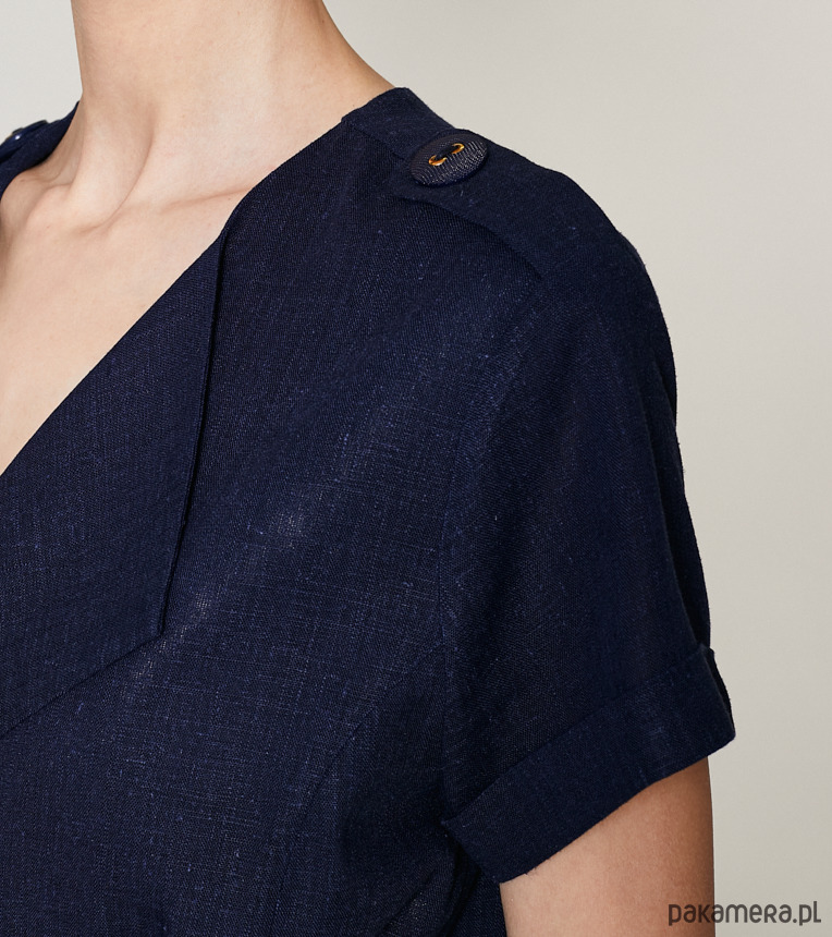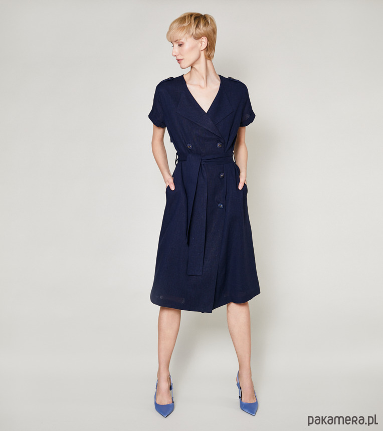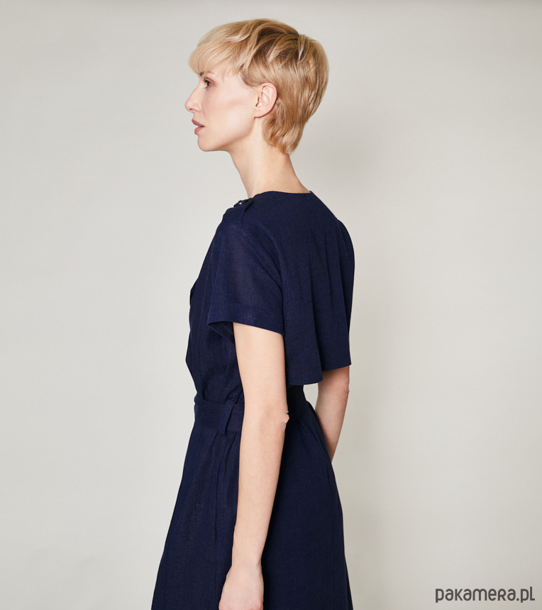Lniana sukienka szmizjerka z krótkim rękawem i bawełnianą podszewką. Posiada ozdobne pagony. Dwurzędowe zapięcie z przodu na duże guziki. Pas podkreśla szeroki pasek.Stanowi nieodłączny element garderoby każdej z nas. Kolor, fason i charakter sukienki sprawia, że nadaje się ona na każdą okazję. Pokaż się w niej w pracy, dodając żakiet, załóż szpilki i idź w niej na romantyczną kolację. Sukces gwarantowany.