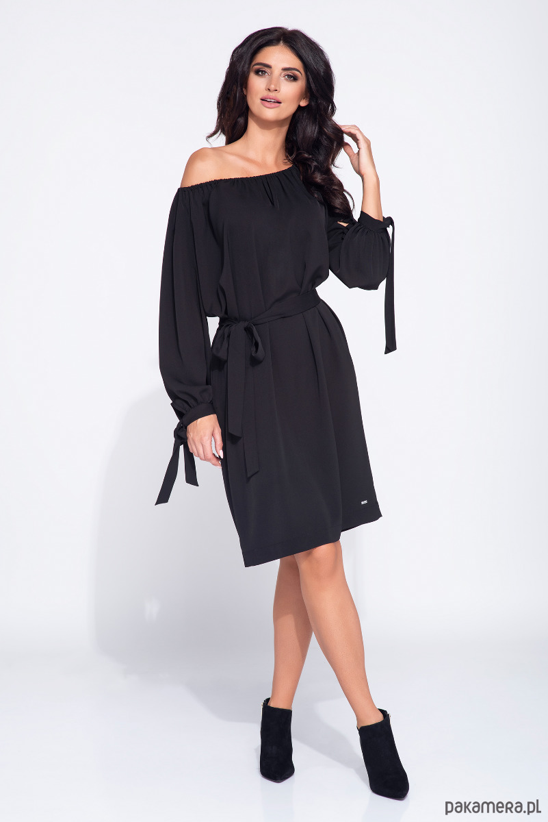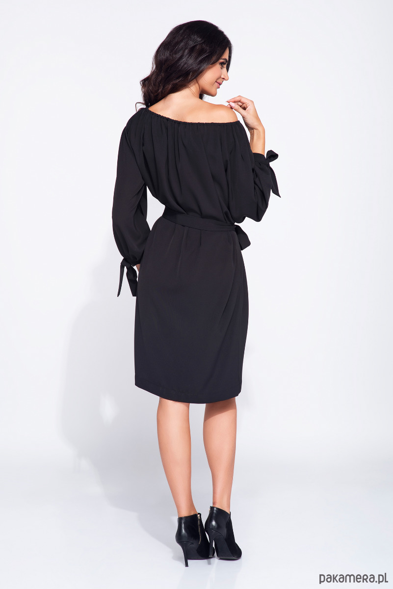 Wyjątkowa sukienka wizytowa z odsłoniętymi ramionami i dekoltem na gumce. Wykonana z tkaniny, która lejąco układa się na ciele. Jest niegniecąca i elegancka. Sukienka przyciąga wzrok ciekawymi detalami takimi jak marszczenia przy rozcinanych rękawach oraz wiązanie na nadgarstkach. Pasek dopasowuje sukienkę w talii lekko bluzując górę sukienki. Sukienka jest elegancka, posiada wieczorowy charakter. Jednocześnie można czuć się w niej bardzo swobodnie.