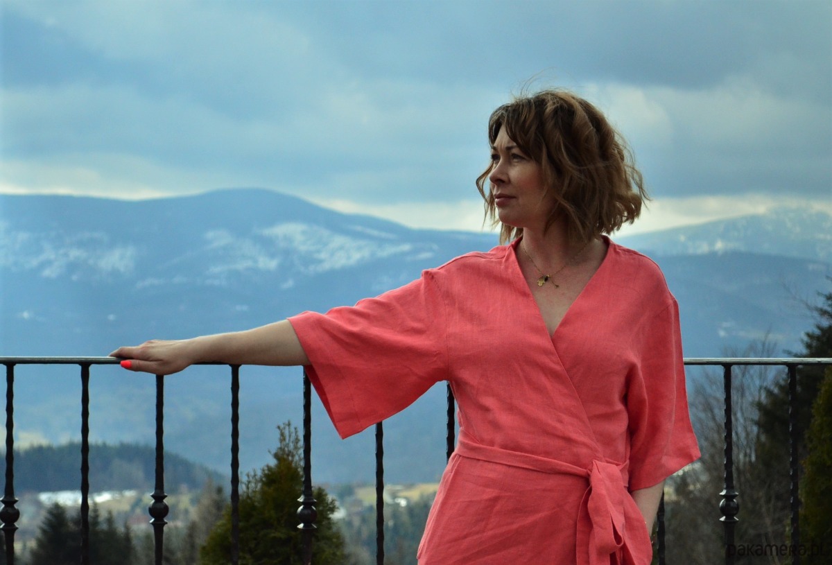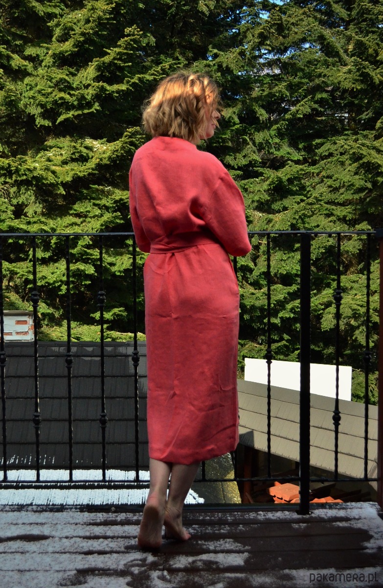 Sukienka o kroju kopertowym. Rękaw tuż za łokieć. W brzegi wszyto długie szarfy do przewiązania. Sprawia to, że sukienkę można swobodnie dopasować do własnej sylwetki. W szwy boczne wszyto kieszenie.