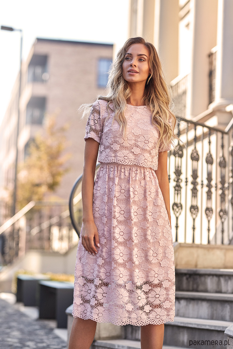 W tej wyjątkowej, romantycznej sukience z koronkowym krótkim topem i spódnicą długości mini oczarujesz otoczenie. Elegancki kwiatowy wzór koronki podszyty jest tkaniną w tym samym kolorze.