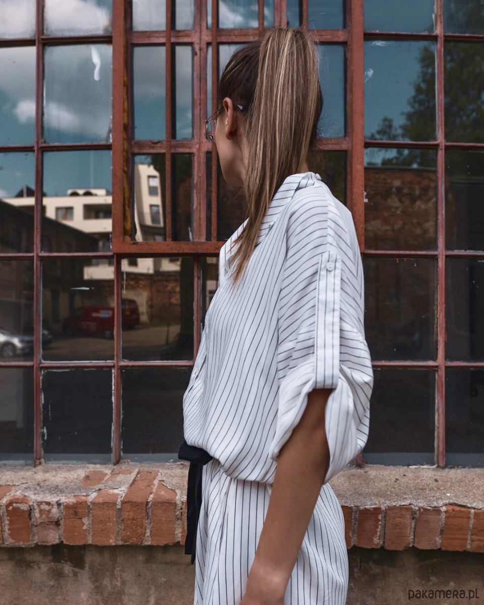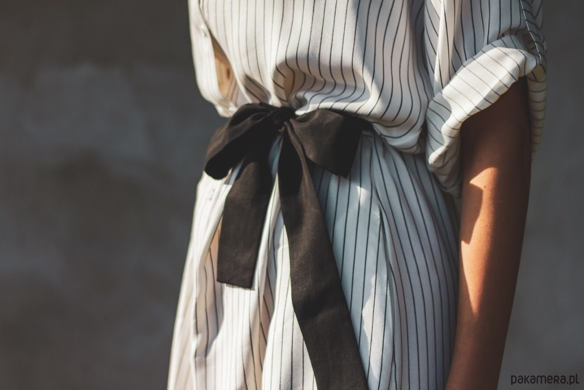 Sukienka koszulowa w czarne paski, o rozszerzanym kroju. Została wykonana z cudownej w dotyku tkaniny o składzie 50% modal i 50% wiskoza. Jest niezwykle lekka i przewiewna. Posiada guziki na całej długości i dwie boczne kieszenie. Rękaw ma możliwość podwinięcia i zapięcia na guzik. Kołnierzyk w sukience można zapiąć albo zostawić lekko rozchylony - w zależności od preferencji :)