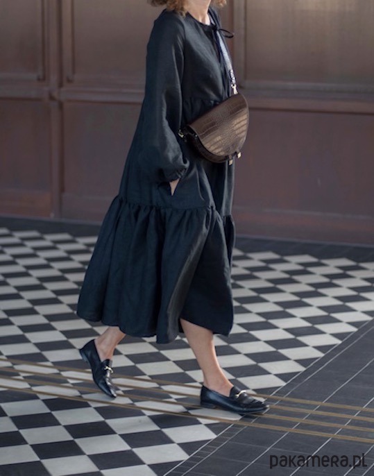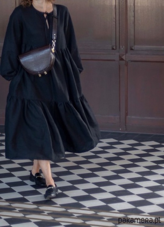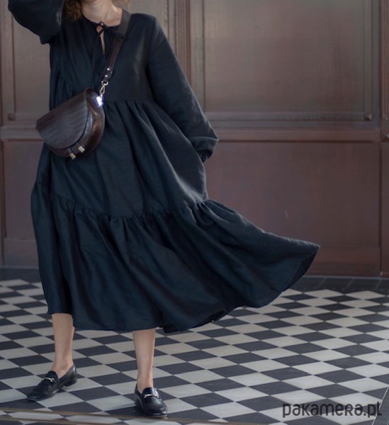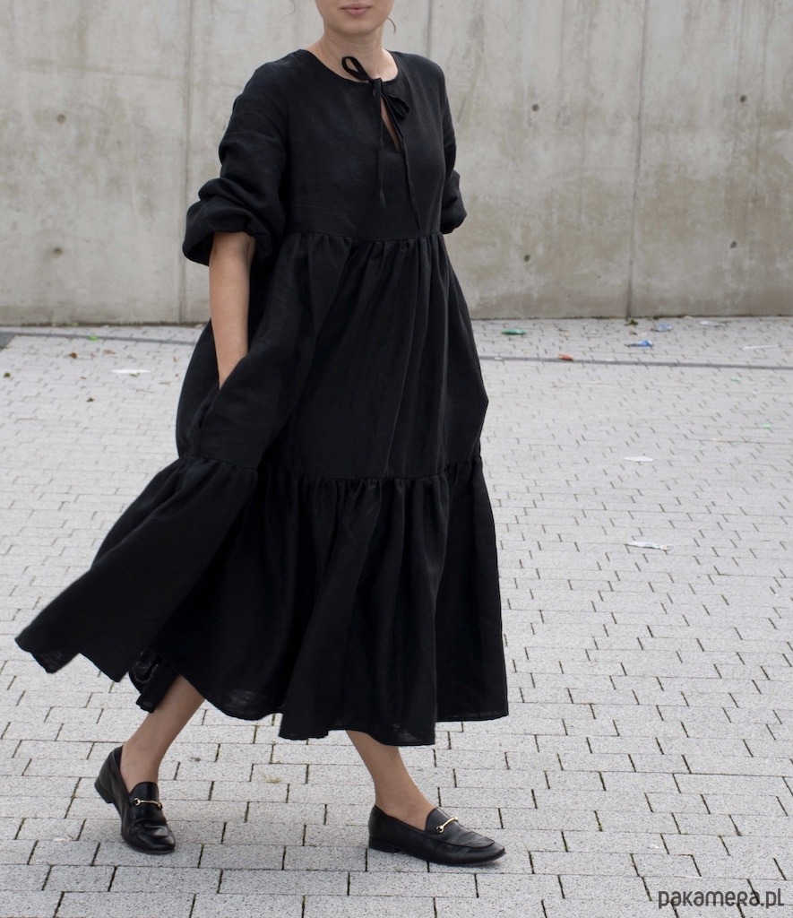 Sukienka w stylu boho z długimi bufiastymi rękawami, które zakończone są gumeczkami. Między falbanami ukryłyśmy dwie duże kieszenie. To sukienka, którą możesz nosić przez cały rok, a zmieniając dodatki typu buty czy torba nadajesz jej swój indywidualny styl. Czarny len jest doskonałą bazą dla biżuterii.