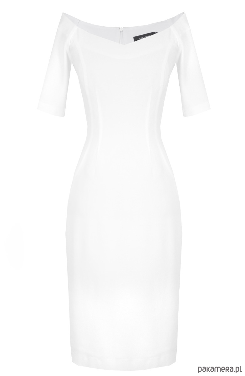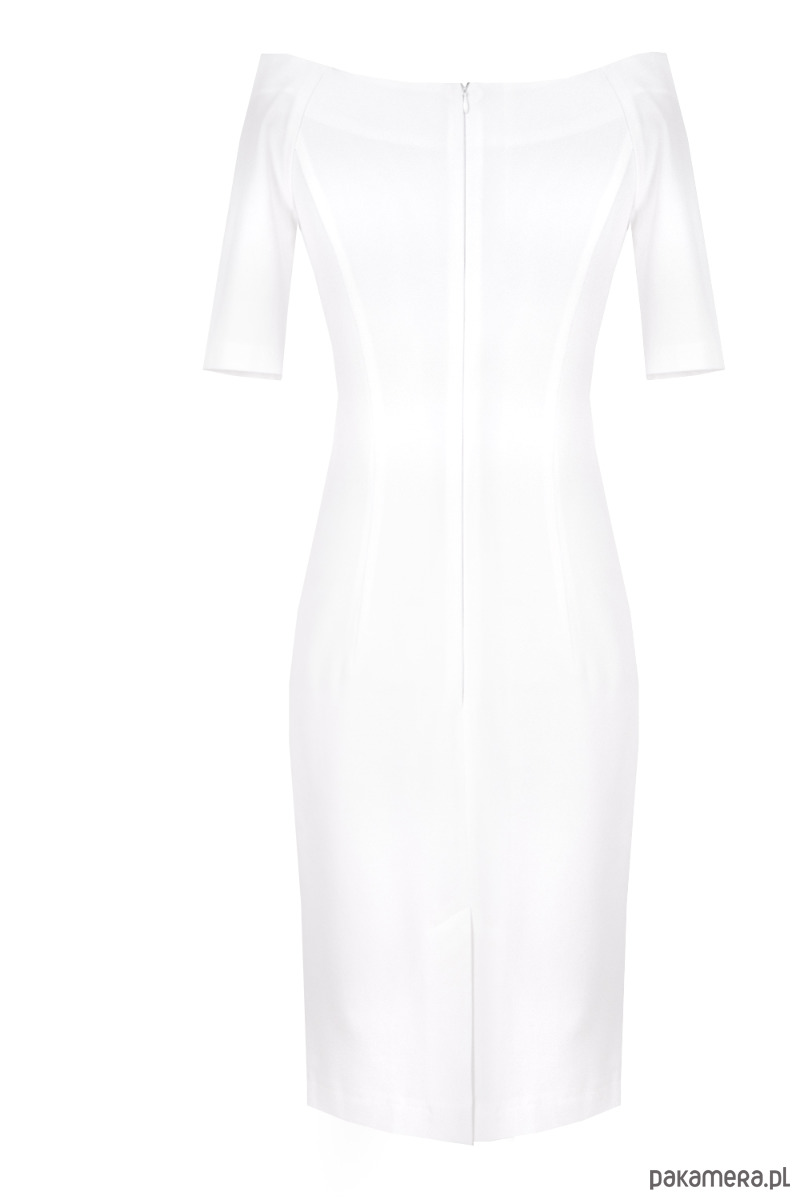 Sukienka ołówkowa uszyta z wiskozy z lycrą w kolorze ecru. Na wiskozowej podszewce. Szeroki dekolt, długość ok 100cm od ramion. Na zamówienie inne kolory. Pranie ręczne.