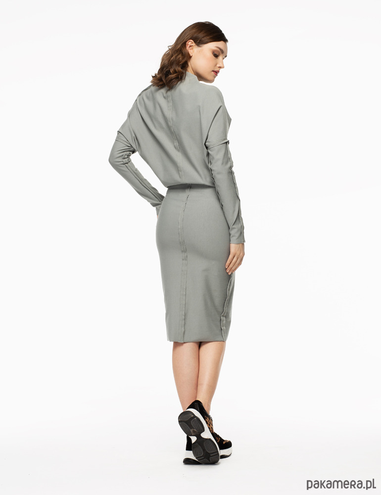 Sukienka dzianinowa o nowoczesnym kroju, pięknie podkreślająca kobiecą sylwetkę. Jej ozdobą są zewnętrzne szwy, tworzące pionowe linie, które dodatkowo optycznie wyszczuplają sylwetkę. Materiał na szwach w miarę użytkowania będzie się rolował, tworząc jeszcze ciekawszy, oryginalny efekt.