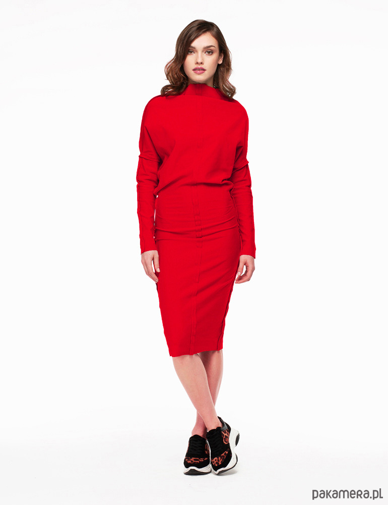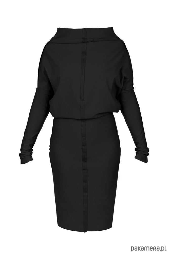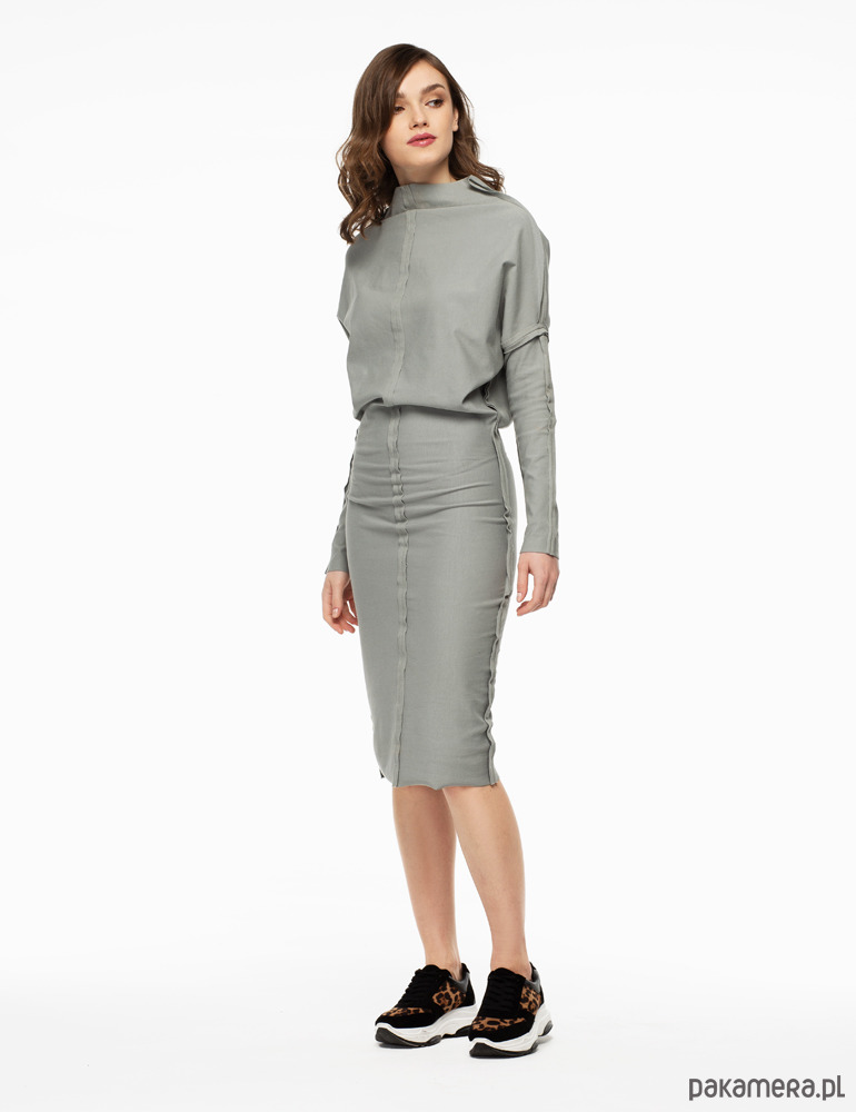 Sukienka dzianinowa o nowoczesnym kroju, pięknie podkreślająca kobiecą sylwetkę. Jej ozdobą są zewnętrzne szwy, tworzące pionowe linie, które dodatkowo optycznie wyszczuplają sylwetkę. Materiał na szwach w miarę użytkowania będzie się rolował, tworząc jeszcze ciekawszy, oryginalny efekt.