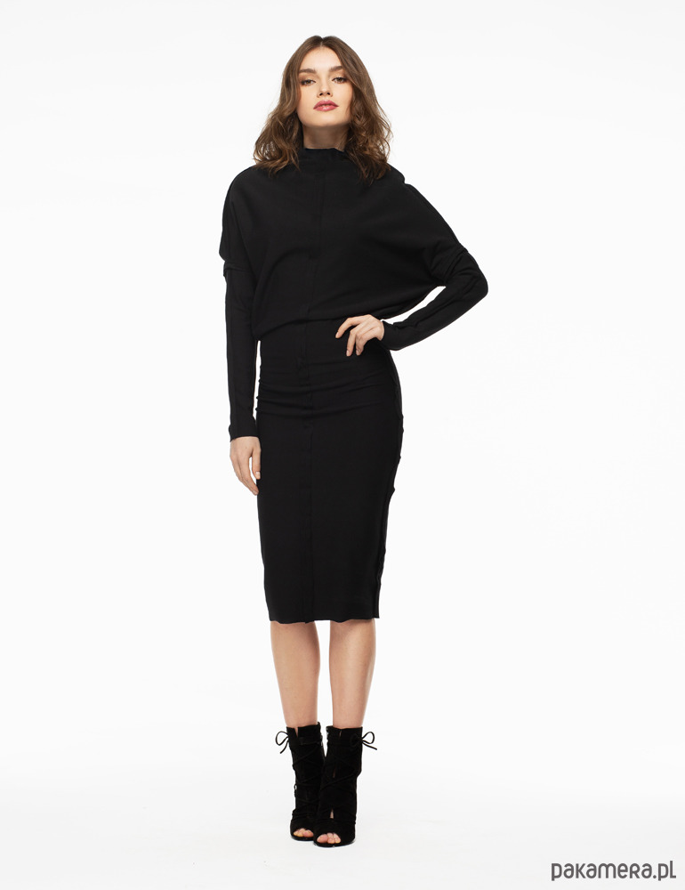 Krój dołu dopasowany, góra luźna, oversizowa, wkładana przez głowę, ramie obniżone, rękaw długi, wąski, szwy zewnętrzne, dekolt szeroki półgolf, który można wywijać do wewnątrz uzyskując w ten sposób dekolt łódkę, brzegi wykończone na surowo.