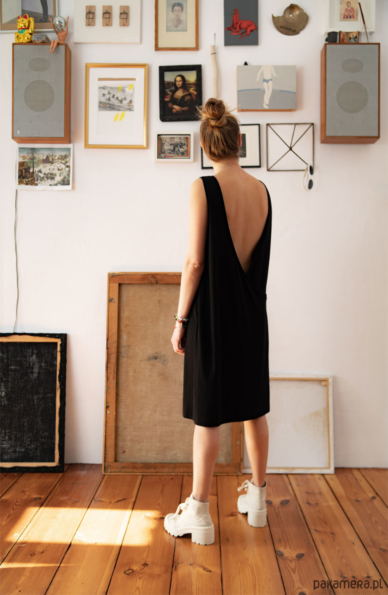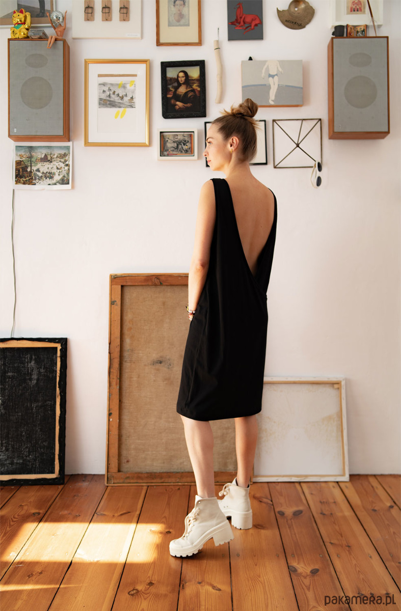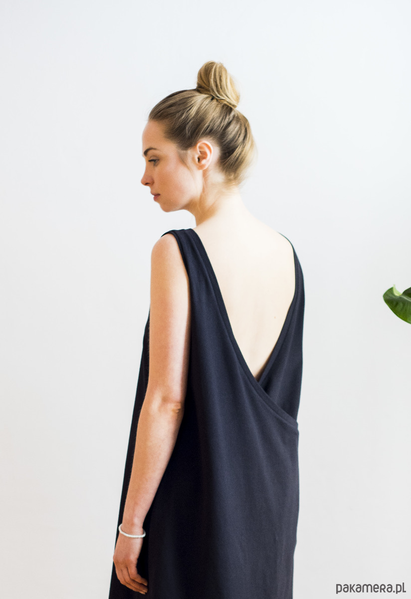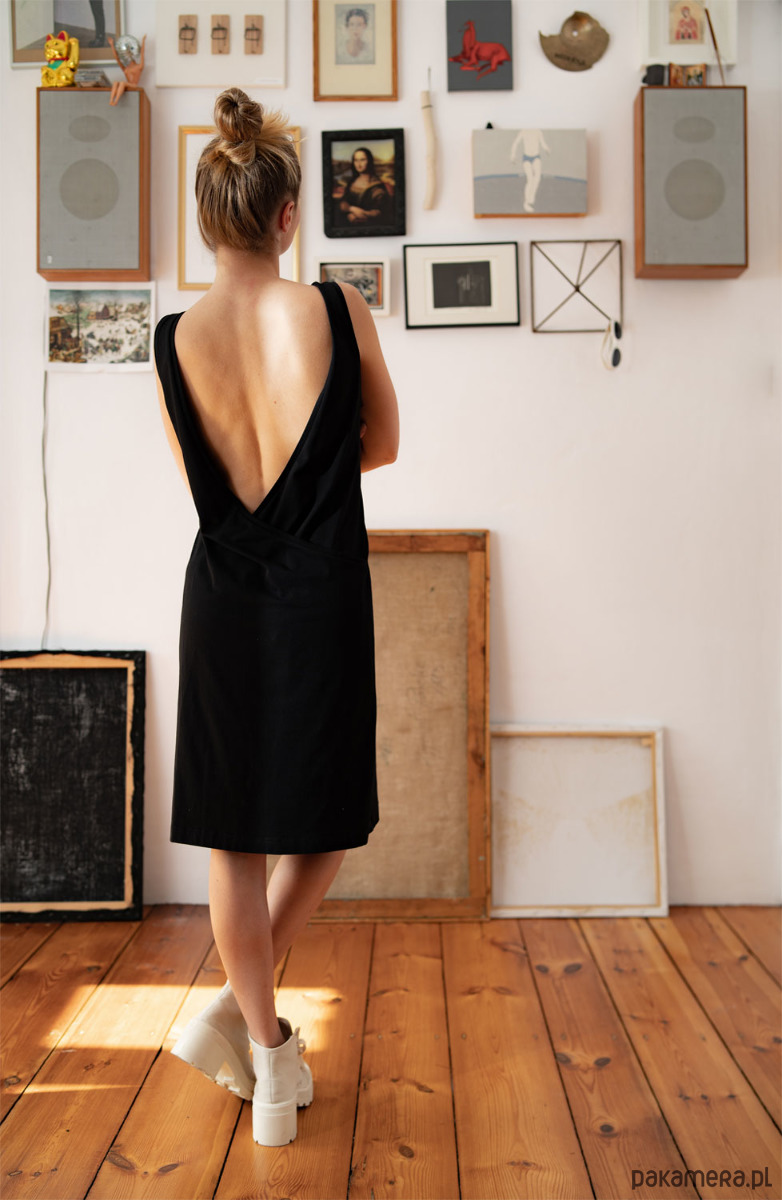 Sukienka o głębokim dekolcie na zakładkę na plecach. Przód to klasyczny dekolt, natomiast tył nadaje całości dziewczęcy charakter.