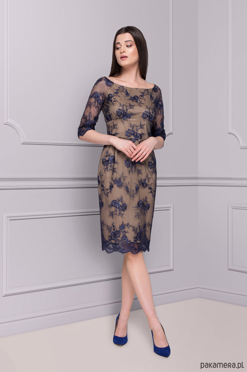 Wizytowa sukienka uszyta z ekskluzywnej koronki z pięknym ozdobnym brzegiem- wykończenie dołu i rękawów. Kolor granatowy na złoto beżowej satynowej podszewce. Można zamówić czarną