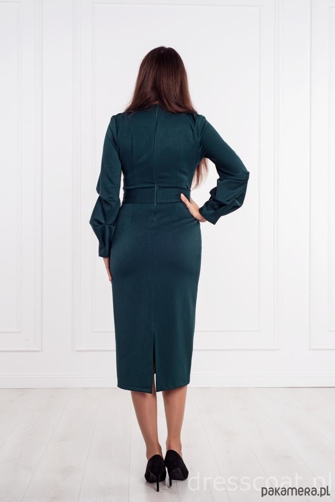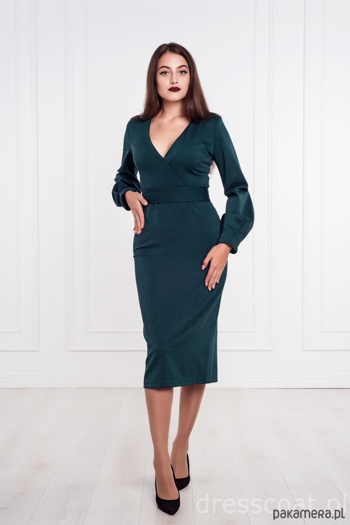 Koktajlowa dopasowana sukienka w przepięknym kolorze butelkowej zieleni, będzie świetnie wyglądać z każdym innym kolorowym dodatkiem. Bardzo kobieca sukienka z wysmuklającym dekoltem V sprawdzi się przy każdej okazji.