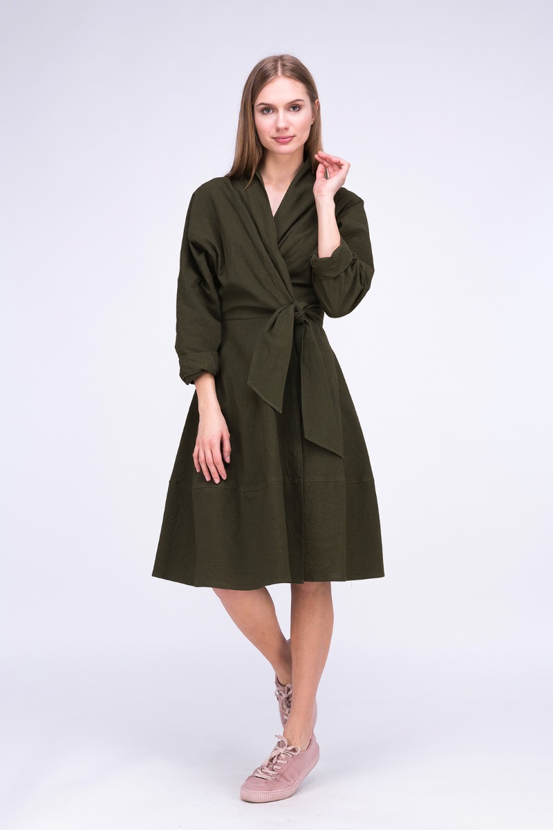 Nie wychodząca z mody klasyka w wersji cashual. Zakładana sukienka-płaszcz z szalowym kołnierzem, przechodzącym w pasek. Ten wielofunkcyjny model możesz nosić związany w talii, lub w wersji otwartej. Idealna na wiosnę i lato dzięki przyjaznej ciału, lekko kiereszowanej bawełnie.