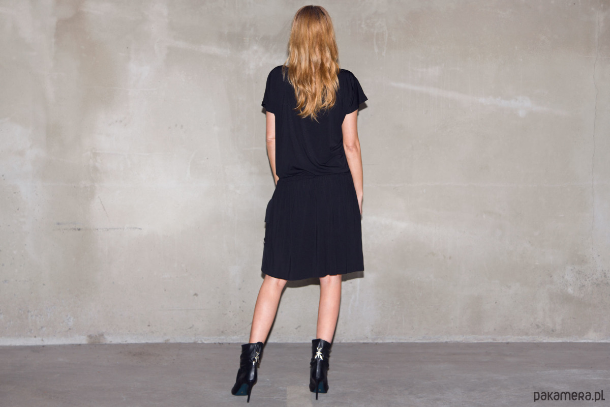 Czarna guma do ułożenia na wysokich biodrach lub w pasie , kieszenie , góra typu kimono , krótki rękaw