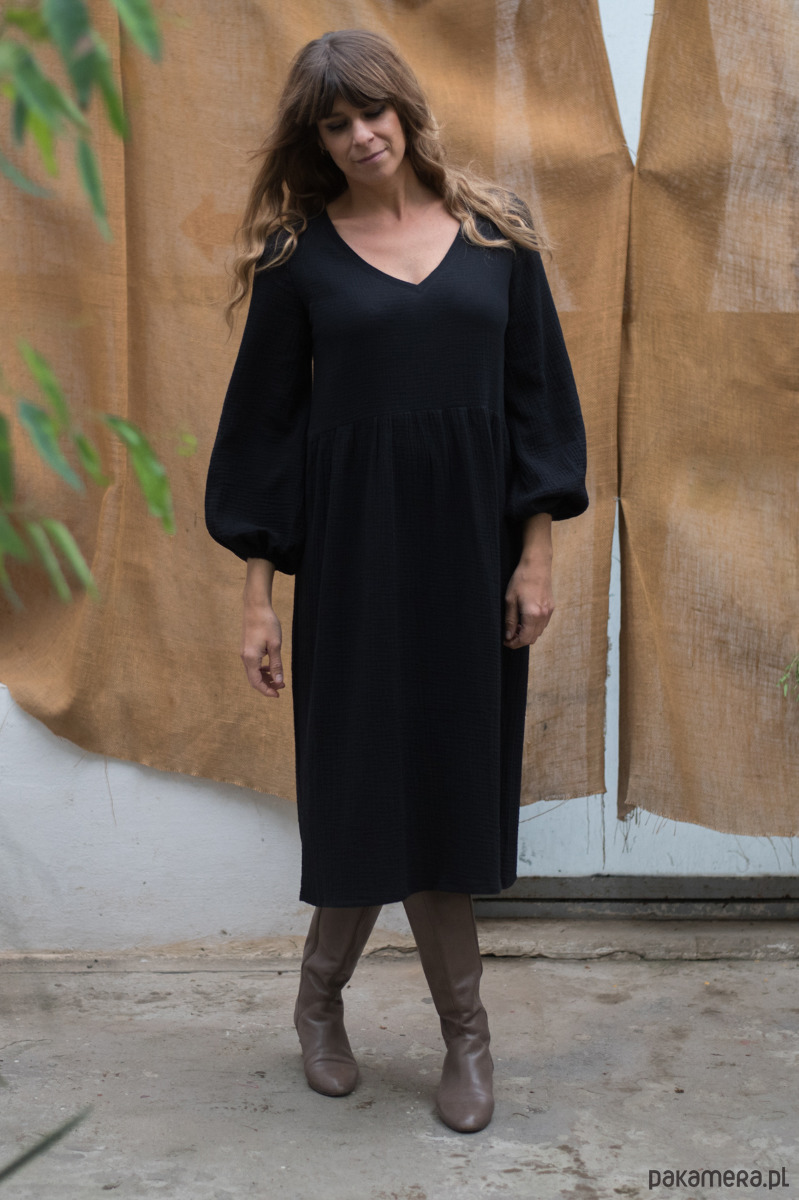 Sukienki w kolorze czarnym jest odcinana na wysokości talii, a szerszy dół świetnie ukrywa niedoskonałości figury jak uda czy biodra.