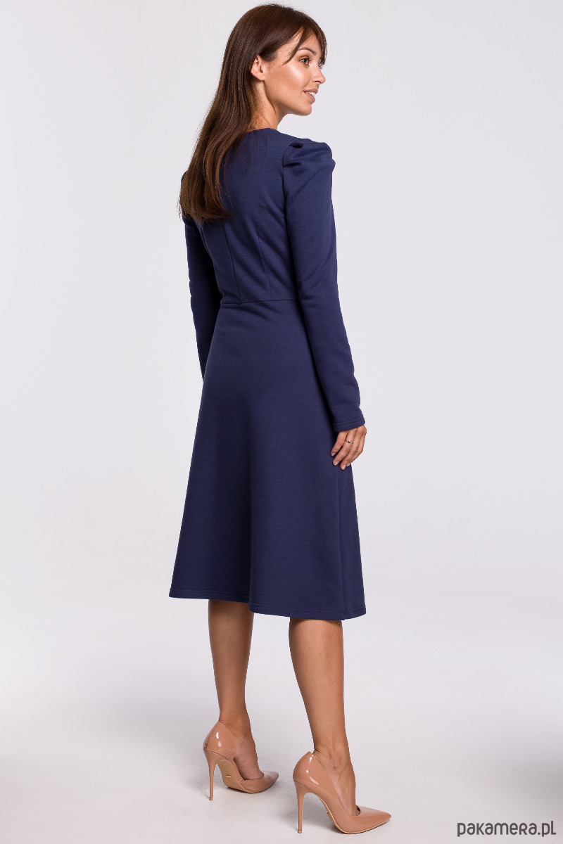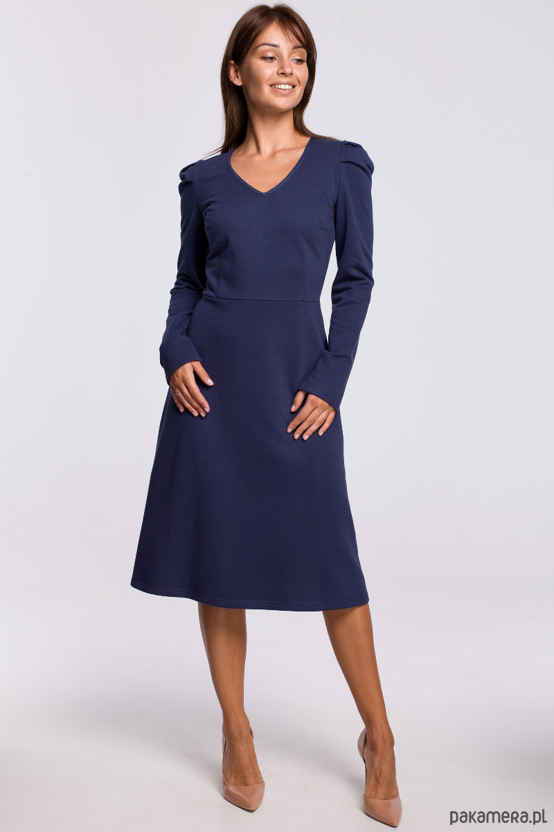 Elegancja tkwi w prostocie. Gładka sukienka bez zbędnych dodatków, o fasonie litery A i długości za kolano, z subtelnym dekoltem i z marszczonymi na ramionach rękawami to tak zwany must-have.